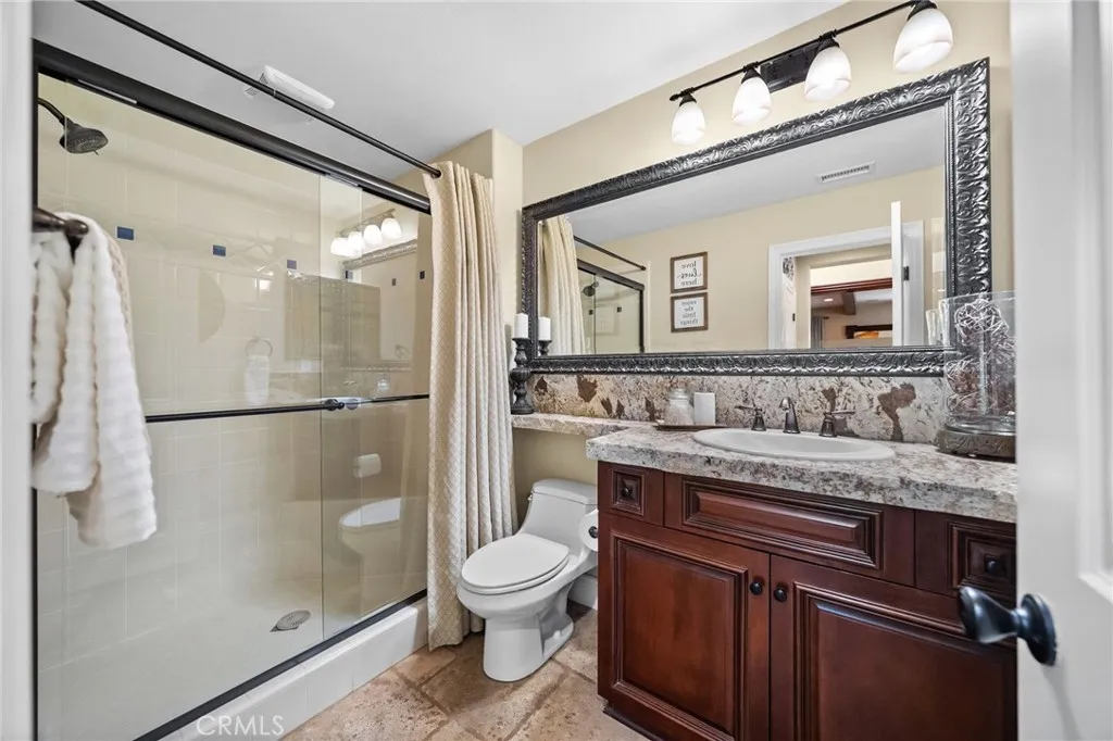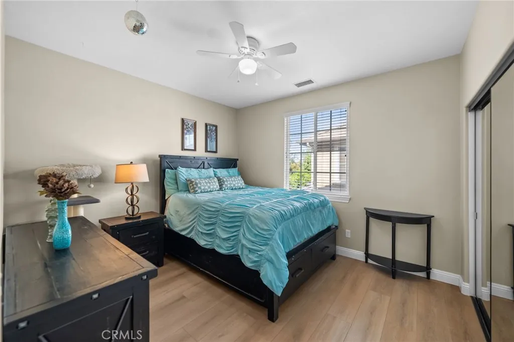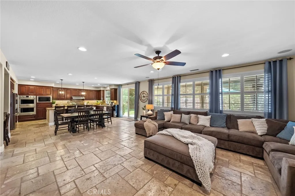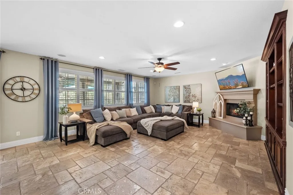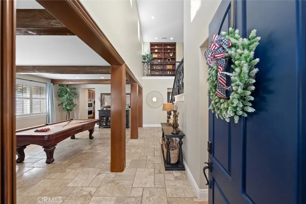 Welcome to 46331 Hunter Trail, a beautifully maintained former model home in the highly sought after Wolf Creek community of South Temecula. This spacious 5-bedroom, 3-bath, 3,506 sq ft residence offers refined finishes with sophisticated comfort. Step inside to a grand entry featuring vaulted ceilings, tumbled travertine tile flooring throughout the main living areas, and stylish beams setting a tone of timeless elegance. This open-concept layout includes a formal living room and formal dining room that flows right into a fantastic family room centered around a beautiful gas fireplace, surrounded by wood shutters, custom built-ins, and surround-sound wiring. This gourmet kitchen features granite countertops and backsplash, stainless steel appliances including double oven and gas cooktop, an oversized center island with bar seating, and abundant cabinet spaceperfect for gatherings and everyday living. Upstairs, enjoy wood-look luxury vinyl plank (LVP) flooring throughout, leading to a spacious primary suite with his and hers walk-in closets, dual vanities, a jetted tub, and a separate shower. Four additional bedrooms provide ample space for family, guests, including a home office. Step outside to your private backyard retreat featuring artificial turf, mature landscaping, and a covered above-ground spathe perfect spot to relax and enjoy Temeculas beautiful evenings. The covered patio provides additional space for outdoor dining and entertaining, all with low-maintenance appeal. Additional highlights include a downstairs bedroom and full bath, custom wrought-iron staircase,