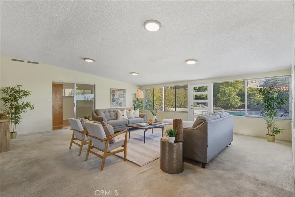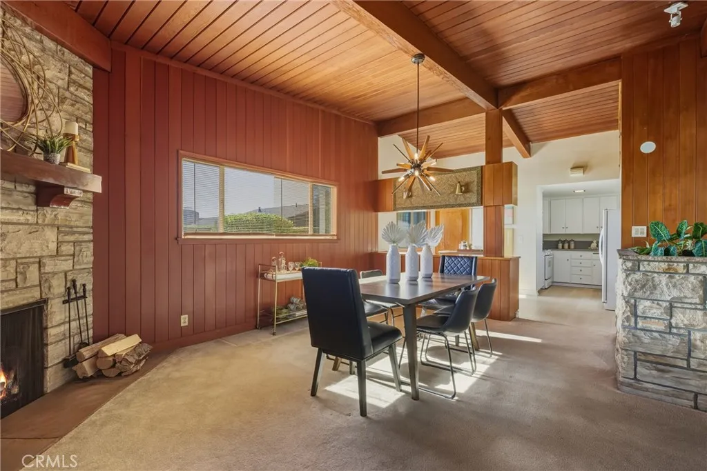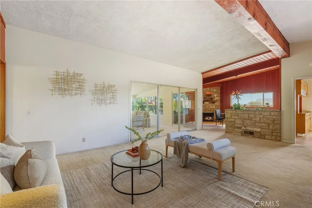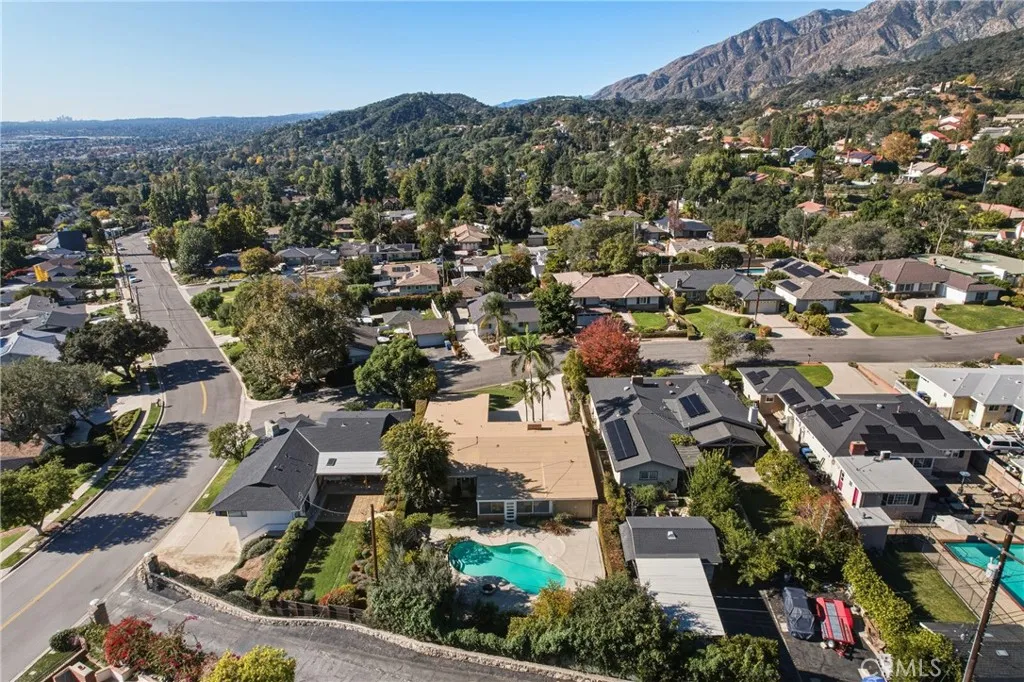 Discover this classic Mid-Century Modern gem tucked on a coveted North Monrovia cul-de-sac, situated on a large 10,374 square foot lot surrounded by lush, mature landscaping. From the hardwood-paneled front door, step into a bright living room featuring a corner white-brick fireplace, beamed ceiling, and wood-paneled accent wall. A flagstone half wall leads to the formal dining room with its own striking flagstone fireplace and wood ceilingperfect for gatherings. The spacious family room, a 1970s addition, offers a wall of windows and direct access to the expansive backyard. A cozy breakfast area with ample wood cabinetry and beamed ceiling connects to the galley kitchen with abundant storage, double sink, stove, and microwave. The laundry room off the kitchen leads to a private bedroom with mirrored closet doors and a bath with original ceramic tile. Two additional bedrooms sit on the opposite wing and share a large full bath retaining its charming period details, including original ceramic tile, pink sink and tub, and hexagonal flooring. With over 2,200 square feet of living space, this home offers room to breathe and plenty of decorating options. The XL backyard is a true retreat with a kidney-shaped pool, firepit, large grassy area, fruit trees, and mountain views. Additional highlights include original hardwood floors, period-appropriate lighting, 2-year old top-of-the line pool equipment, central air & heat, a 2-car attached garage, and a spacious driveway. Move-in ready and filled with timeless character, this home beautifully blends mid-century style with everyday