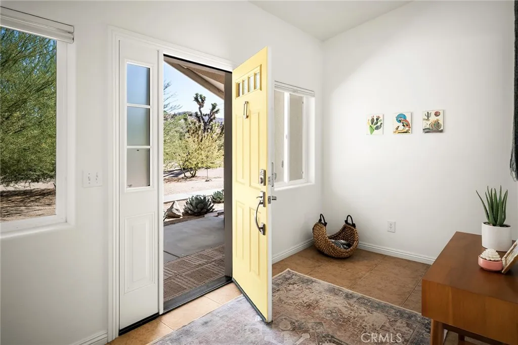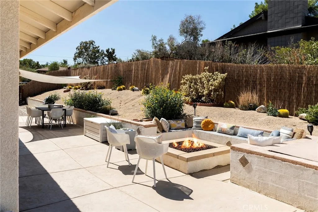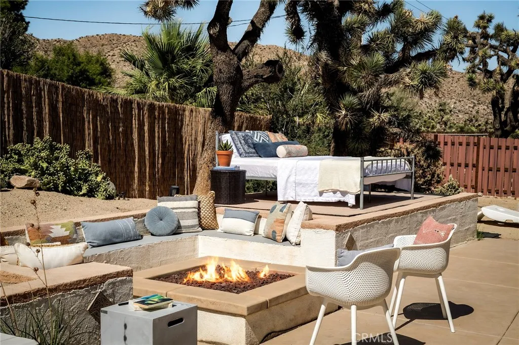 Set against sweeping mountain views in one of the areas greenest and most established neighborhoods, this beautifully maintained 3-bedroom, 2-bath home with bonus room sits on a prime half-acre corner lot in desirable Country Club Estates. A mature, tree-lined front yard with lush desert landscaping creates exceptional curb appeal and a welcoming arrival. No HOA. Newly paved streets, connected to public sewer and natural gas, school bus stop, and a short walk to the areas only golf course and popular caf, The Roost. Conveniently and centrally located just a short drive to Joshua Tree, Pioneertown, and Palm Springs. The open-concept layout features high ceilings and abundant natural light, with mountain views visible from most rooms. Modern fixtures, ceiling fans throughout, custom blinds and curtains, and stylish flooring create a comfortable and inviting interior. The large primary suite offers a spacious bathroom with dual vanities, extra large soaking tub, walk-in shower, and a generous walk-in closet. TVs are included in all bedrooms. The fully fenced backyard is designed for entertaining and relaxation, featuring a custom patio with built-in gas fireplace and seating, raised lookout deck with outdoor queen bed, 4-person hot tub, oversized cowboy tub, shaded dining area, BBQ, and beautifully landscaped desert grounds. Additional features include a fully equipped kitchen with modern appliances, electric fireplace, laundry room with newer washer/dryer, attached two-car garage, and rare concrete roof as well as new water heater. Offered partially furnished; buyers to reque