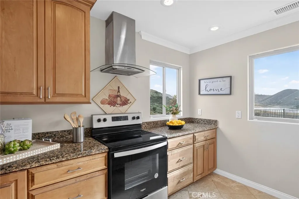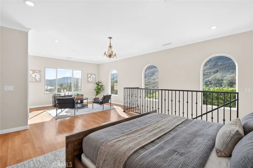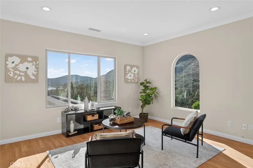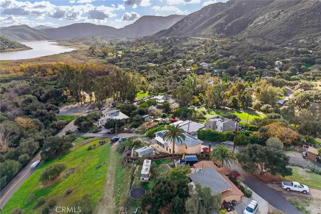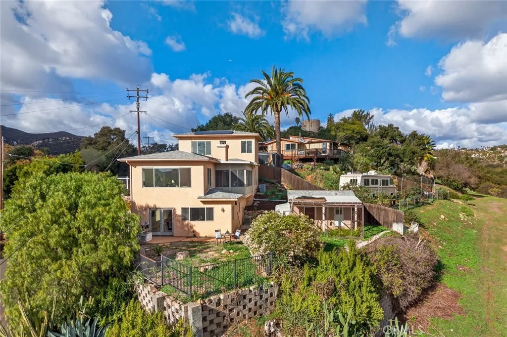 Enjoy sweeping views of Lake Hodges from this light-filled hillside home set in a quiet, nature-rich setting just minutes from everyday conveniences. Large windows bring the outdoors in, while thoughtful architectural details include crown molding, arched doorways, recessed lighting, and a cozy fireplace. The entry level features a spacious living room, a bedroom suite, a flexible office or den, and an enclosed patio ideal for year-round use. The lower level offers an upgraded kitchen, an oversized dining area for gatherings, a full bath, and a generous laundry and utility room. French doors open to the backyard for easy indoor-outdoor living. The top-floor private suite serves as a peaceful retreat with a walk-in closet, full bath, and stunning lake views. Close to hiking and biking trails, this home offers a rare blend of views, privacy, and accessibility.
