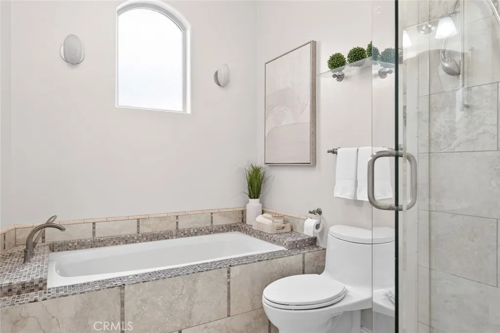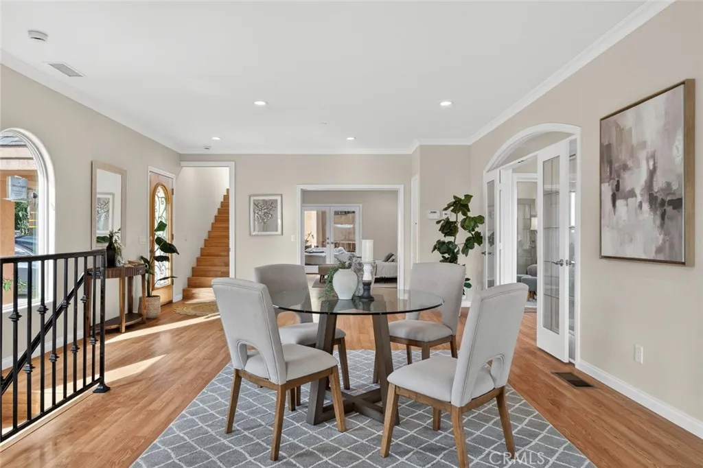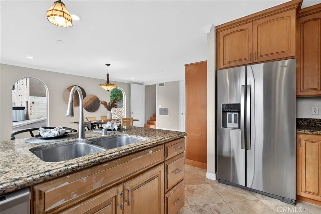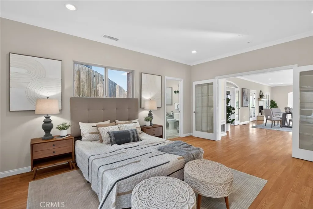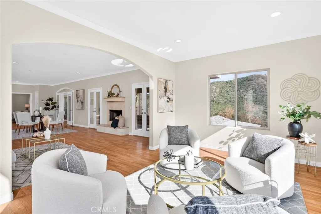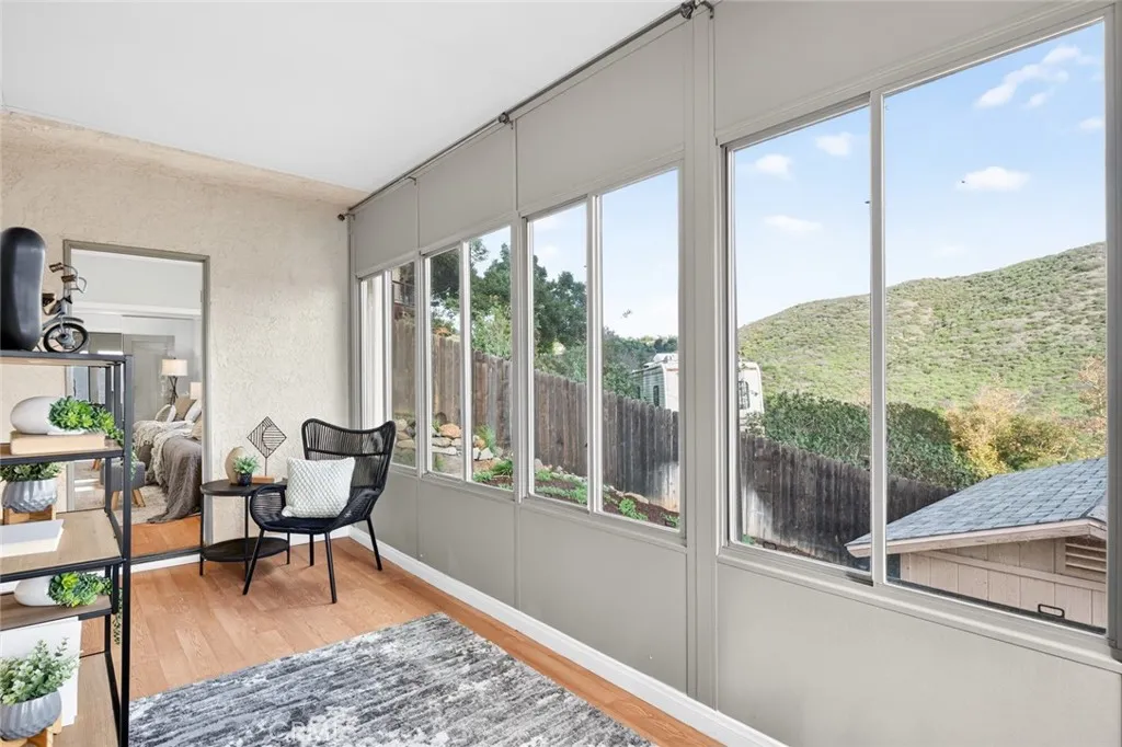 Enjoy sweeping views of Lake Hodges from this light-filled hillside home set in a quiet, nature-rich setting just minutes from everyday conveniences. Large windows bring the outdoors in, while thoughtful architectural details include crown molding, arched doorways, recessed lighting, and a cozy fireplace. The entry level features a spacious living room, a bedroom suite, a flexible office or den, and an enclosed patio ideal for year-round use. The lower level offers an upgraded kitchen, an oversized dining area for gatherings, a full bath, and a generous laundry and utility room. French doors open to the backyard for easy indoor-outdoor living. The top-floor private suite serves as a peaceful retreat with a walk-in closet, full bath, and stunning lake views. Close to hiking and biking trails, this home offers a rare blend of views, privacy, and accessibility.