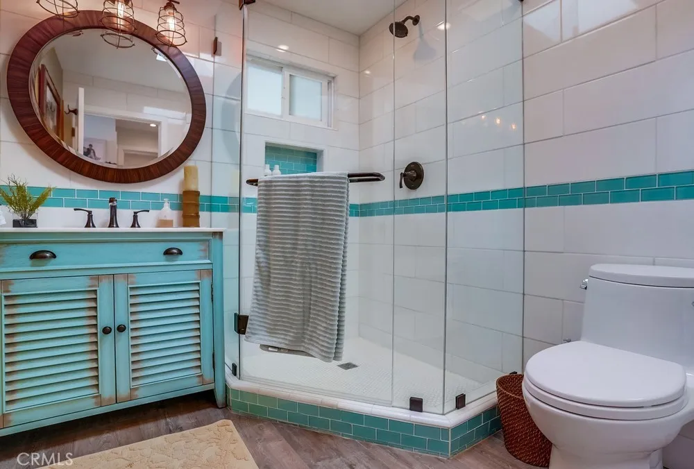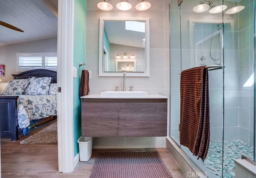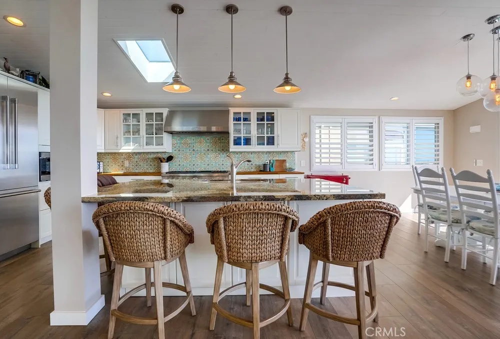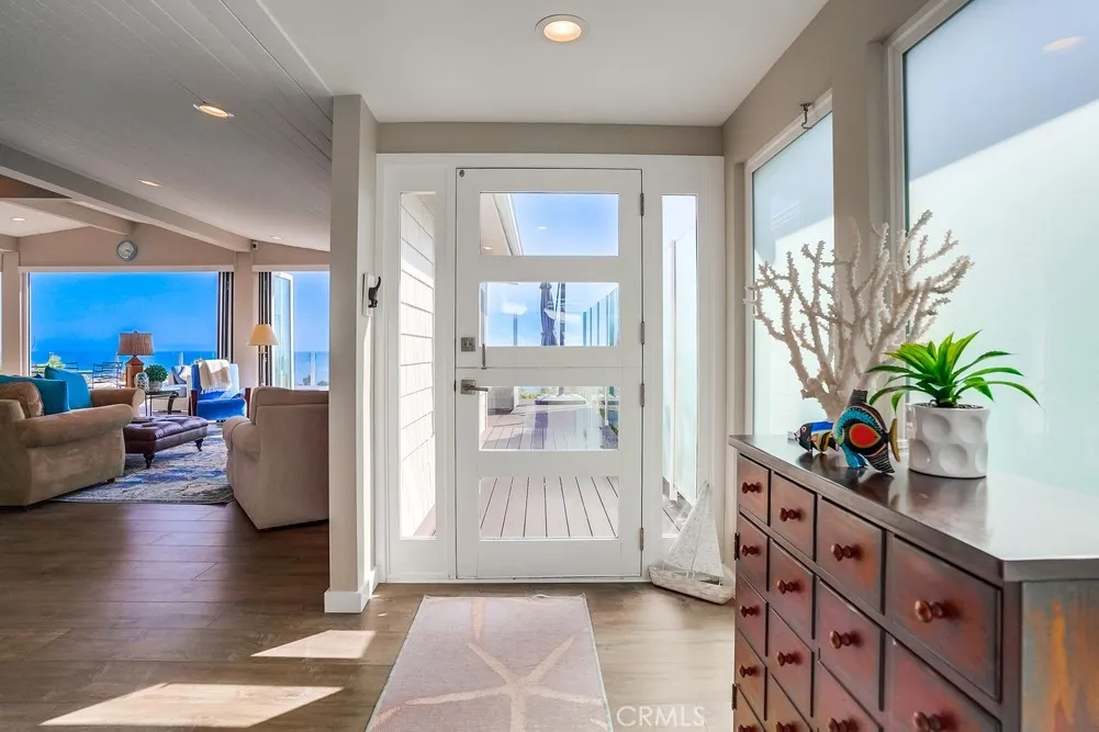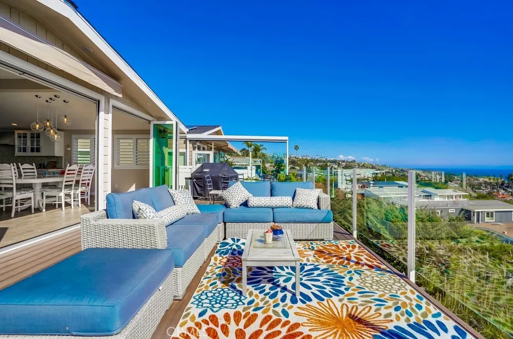Fantastic opportunity to own in the highly desirable Palos Verdes Shores! Enjoy panoramic ocean & Catalina Island views from this amazing, completely remodeled home! Custom, turnkey 3-bedroom, 2-bathroom home is located on a quiet cul de sac! 1950+ sq. ft. of living space gives you the perfect forever home. Private, wraparound Trex deck with glass railings boasts stunning ocean views, magical sunsets & electronic awning for shade. Enjoy great views from open concept kitchen featuring Granite countertop island & breakfast bar, stainless steel appliances, 6-burner gas cooktop, Thermador oven, hooded vent, dual sink basin, built-in microwave, wine fridge, Thermador sub-zero refrigerator, recessed lighting, pantry, soft-closing cabinetry & sliding pots & pans drawers. Light & bright open concept living room offers high-beam ceilings, folding panoramic doors, deck access, & stunning ocean & sunset views. Dining area features exquisite chandeliers, outdoor deck access, beamed ceilings & jaw-dropping ocean views! Primary bedroom boasts beamed ceilings, skylight, ash wood ceiling fan, walk-in closet with custom cabinetry/drawers, skylights & recessed lighting. Bathroom ensuite equipped w/tranquil polished stone floor walk-in shower & large soaking tub. Guest bedroom features mirrored sliding door closet, recessed lighting & ceiling fan. Third bedroom can also be used as a gym or office. Huge storage room & workshop spans width of home. Individual laundry room features storage drawers & cabinetry plus pet door. Lots of natural light, dual pane windows, wide plank easy care waterproo