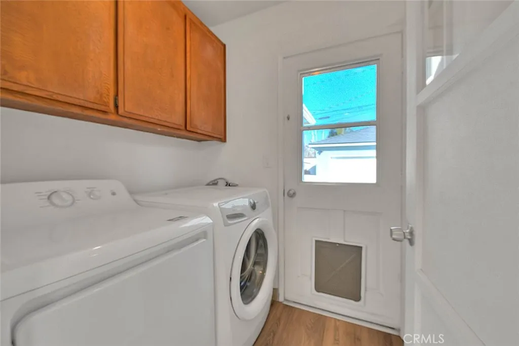 Charming Lakewood home with a freshly painted exterior that boasts great curb appeal. An appealing floorplan includes 3 bedrooms, 1 1/2 bathrooms, a spacious family room with fireplace, formal dining area and living room. Neutral interior wall color will compliment any desired decor. The kitchen is nicely sized with generous amounts of storage and has a counter that opens to the dining room. A great way to open up the floor plan while also offering a practical way to serve guests. Also, there is plenty of counter space to work within the kitchen. Convenient indoor laundry room with extra storage cabinets overhead. Always a bonus to have more storage space inside. Upgraded laminate flooring in the kitchen, family room and dining room, shows sharp! Recessed lighting adds another nice update to the family room. The dramatic brick corner fireplace creates a relaxing ambiance that invites you to sit and enjoy. Primary bedroom is comfortably sized and enjoys a ceiling fan. The living room has wonderful natural light and can be used as a home office space, currently staged as that. Wooden floors are in the living room, hallway and all 3 bedrooms for those who can appreciate the vintage beauty of an era that showcased quality construction materials. Private backyard has low maintenance concrete without lawn but there is a raised planter for greenery touches. Detached 2 car garage is located behind the side gate/fencing. The home is located to many nearby amenities including multiple parks including Heritage Park, Del Valle Park, W. San Gabriel River Parkway Nature Trail. There are