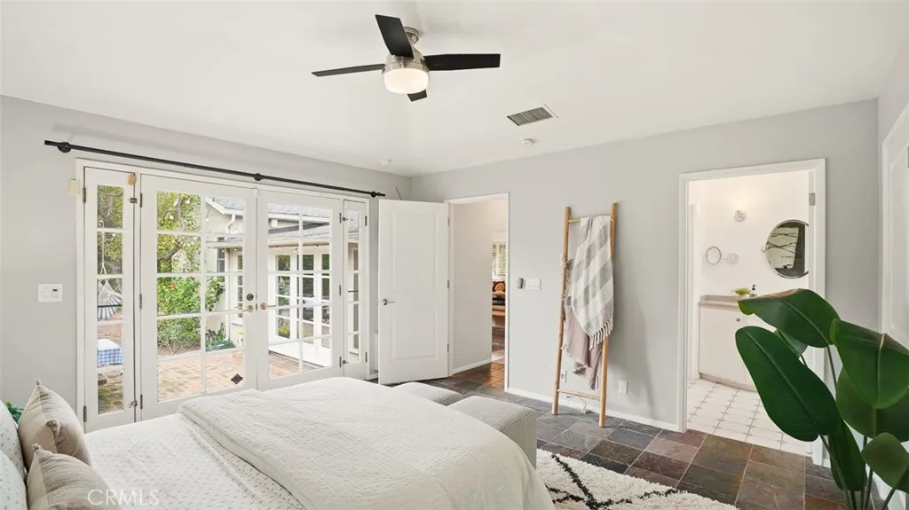 Tucked behind tall privacy hedges on a prime corner lot, this beautifully updated 3-bedroom + office, 3-bath ranch-style home offers effortless indoor-outdoor living in the heart of Sherman Oaks. Bathed in natural light, the thoughtfully designed floor plan blends classic charm with modern updates. A vaulted living room with beamed ceiling anchors the home, flowing seamlessly into a dining room that opens directly to the expansive backyard. The updated kitchen features Caesarstone countertops, stainless steel appliances, recessed lighting, and clean, timeless finishes. The spacious primary suite is a true retreat, complete with dual walk-in closets, French doors going out to the backyard, and a spa-inspired bath complete with soaking tub. Two generous secondary bedrooms and updated baths are thoughtfully positioned in a separate wing, while a detached office provides an ideal work-from-home setup or creative studio. Step outside to your own private oasis: a heated, covered saltwater pool and spa, built-in BBQ area, mature landscaping, and glowing bistro lights create the ultimate setting for entertaining or unwinding under the stars. Alley access to the two-car garage ensures both convenience and discretion. Recent upgrades include a new roof, Nest thermostat, Google Nest cameras, DoorBird video doorbell, and ADT security system. Refined, private, and move-in ready welcome home!