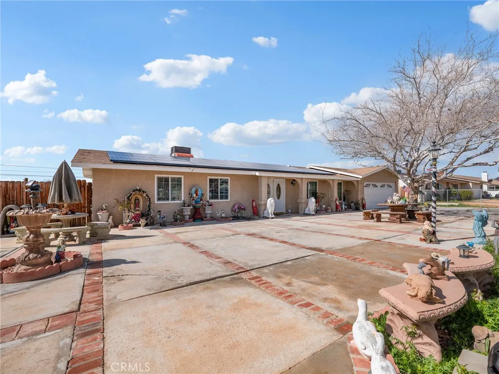 Welcome Solar Powered Home in a desirable area of Apple Valley! This home features 3-bedroom, 3-bath home with a versatile den/office, offering approximately 1,550 sq. ft. of total living space. The main home features 1,431 sq. ft., plus a permitted 24 sq. ft. half bath and an additional 95 sq. ft. living room extension, providing extra functionality and comfort. Enjoy energy efficiency with solar power and appreciate the fully fenced front and back yardsperfect for privacy, pets, and entertaining. The property features extensive concrete work and an extended covered patio, creating a great outdoor living space for gatherings or relaxing evenings. Inside, the kitchen has been tastefully upgraded with new countertops and cabinets, offering a fresh and modern feel. The spacious primary suite includes a step-in shower in the master bath for added convenience. Located in Apple Valley, this home combines comfort, efficiency, and practical upgradesall ready for its next owner. Schedule your private showing today!