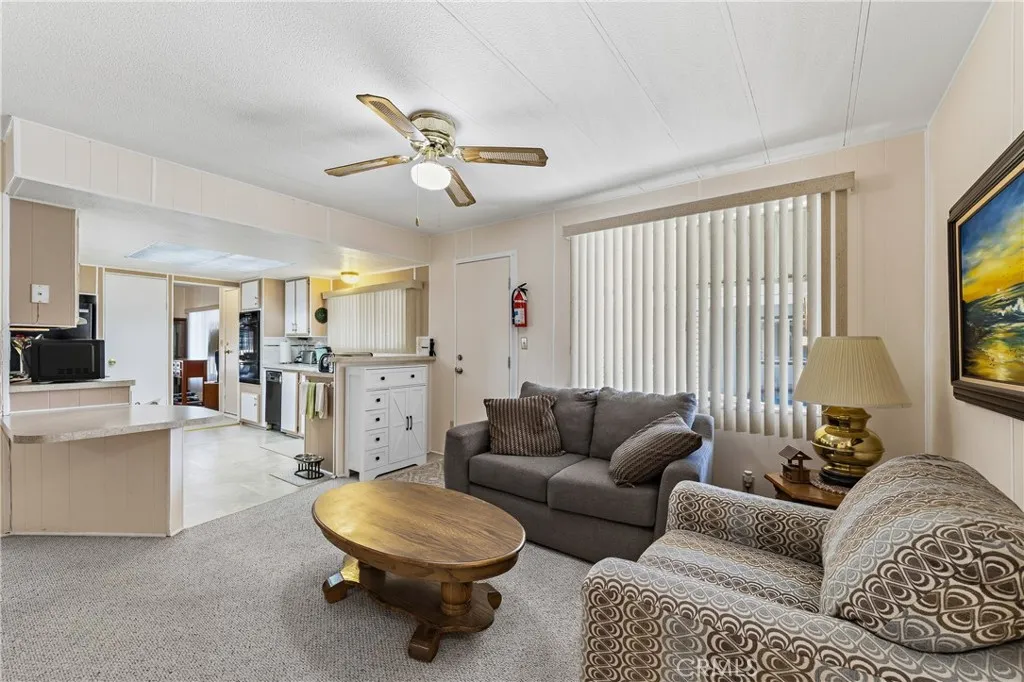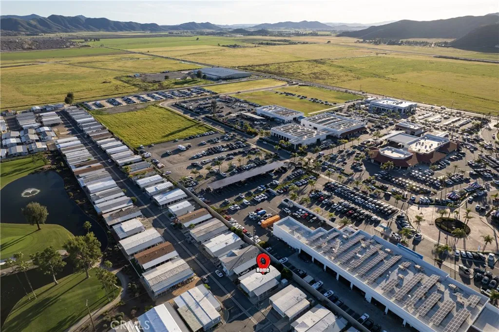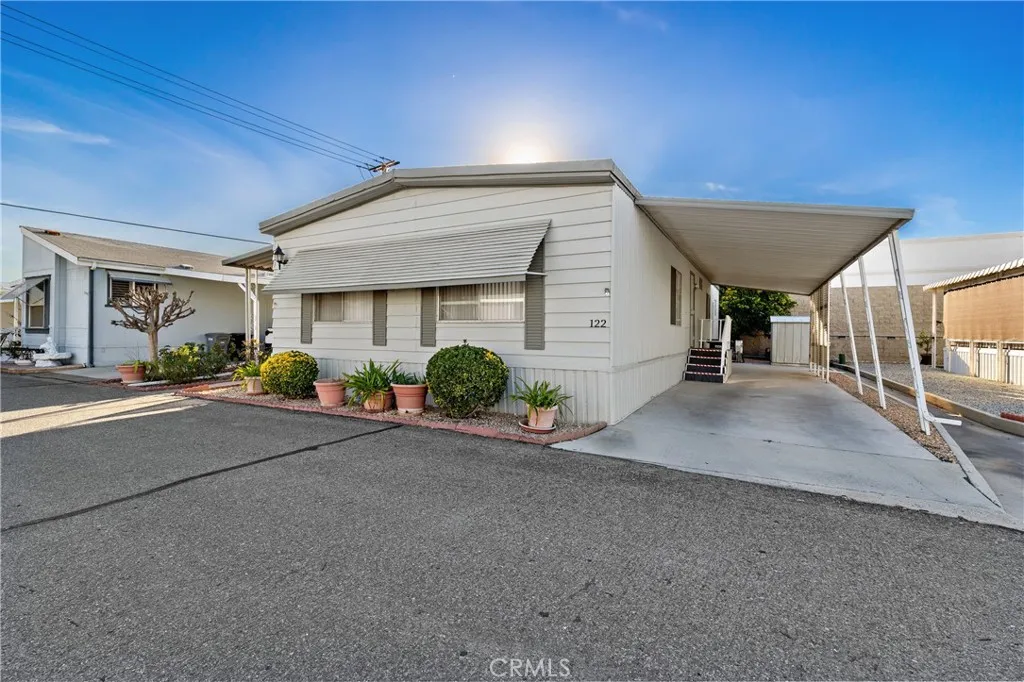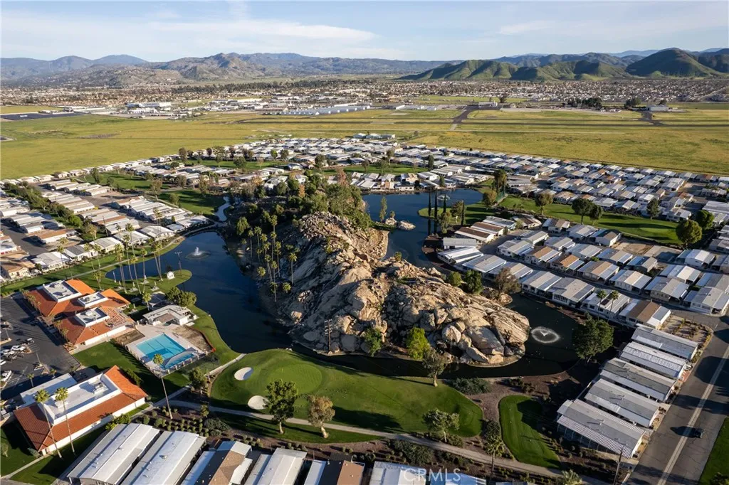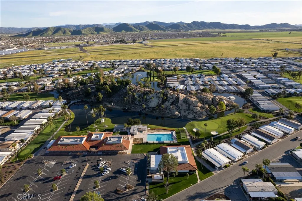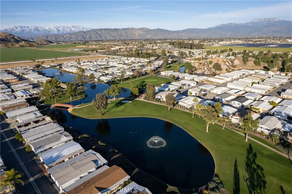 Well-maintained 2 bedroom 2 bath located in scenic The Lakes at Hemet West senior 55+ mobile home park. Formal living/dining combo with low-pile Berber carpet, ceiling fan, and built-in buffet hutch. Galley kitchen has gas cooktop, dishwasher, refrigerator, breakfast bar, and newer gas oven/boiler. Cozy family room with access to raised covered front porch. Master has ceiling fan, two closets, and dual-sink vanity with oversized stall shower. Inside laundry shelving, washer and dryer included. Guest bedroom as en suite full bath also accessible from main living area. Both HVAC and energy-saving evaporative cooling unit. Security screen doors. Roof resealed approximately 3 years ago and home was recently re-leveled. Extra tall carport accommodates higher-rise vehicles. Handicap accessible ramp. Easy-care rockscaping. Bearing fruit trees including navel oranges, loquat, and "cherry" guava. Park amenities include 9-hole par 3 Golf Course, heated pool and spa, indoor shuttleboard court, catch-and-release fishing, pickleball court, bocce ball, horseshoes, picnic area, playground, dog park, and community garden. Clubhouse and banquet room with kitchen facilities, billiard tables, fitness center, ceramics room, library/reading room, and community laundry. Hosted events. Monitored gate access. One of the nicest parks in the valley.