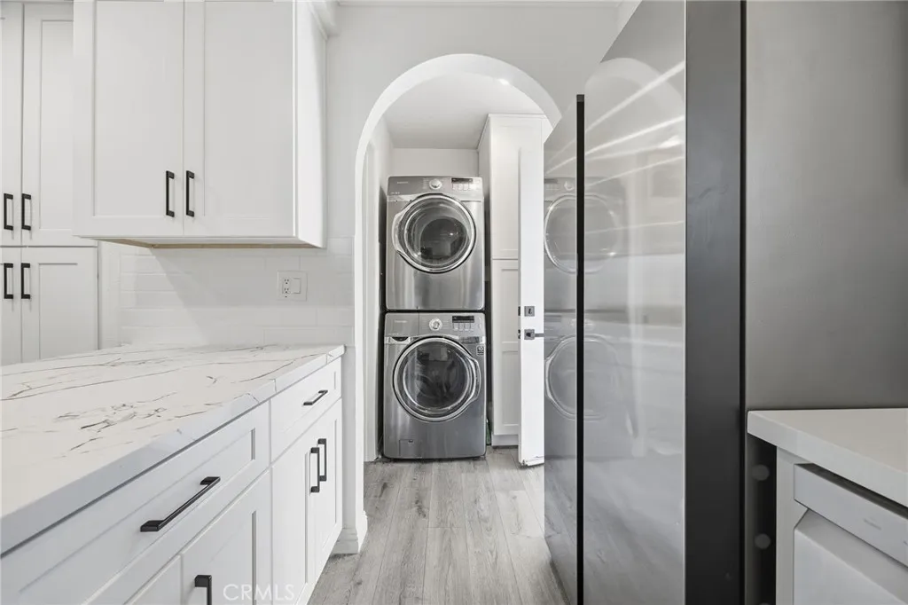 COMPLETELY RENOVATED TURNKEY HOME WITH DIRECT 2 CAR GARAGE ACCESS AND IN UNIT LAUNDRY. This beautifully remodeled Tustin Place residence has been extensively upgraded and renovated. The brand new gourmet kitchen is the centerpiece of the home, featuring all new custom cabinetry with soft close drawers and doors, quartz countertops, a full custom tile backsplash, stainless steel appliances, and new modern recessed lighting with updated wiring. Home also has highly sought after in unit laundry for double stacked washer and dryer and custom built cabintery allowing for plenty of extra storage. The flooring has been completely redone throughout the entire home, creating a seamless, modern look from top to bottom. Additional interior upgrades include fresh neutral paint, dual pane windows, custom crown molding, and new baseboards. The electrical panel has been upgraded along with new wiring and recessed lighting throughout. Major improvements also include a new water heater, new toilets, and updated vanities and shower. One of the most desirable features is the rare direct access private 2 car garage, complete with a new door, motor, and newer epoxied flooring. The entire row of garage exteriors throughout the community has also been fully redone, enhancing curb appeal and long term value. Lightly lived in for only two years since completion of the renovation.