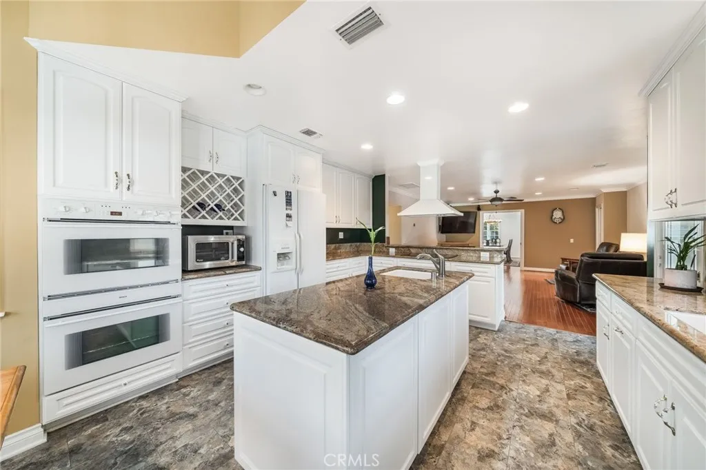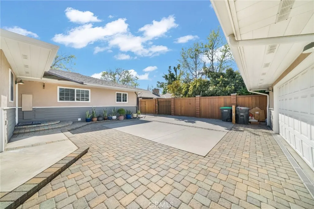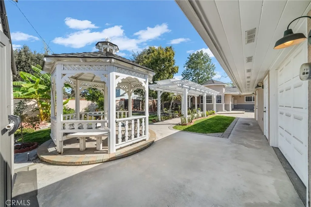 Welcome to the best street in Orange, a one-block tree-lined street, a short walk to Old Towne, and a short drive to all freeways. Known as the kibby house, this sprawling 4-bedroom 4-bath ranch home has charm and personality. The front yard is a display of color from the multiple flowerbeds, and mature trees accent the winding walkway into the house. A long driveway has pavered sections. gated parking leading to additional parking with a 2-car garage. Attached to the garage is an 830 sq. ft. workshop, adu, or game room featuring a custom tile 3/4 bath, vaulted ceilings with skylights, upgraded power, and garage access. The rear yard also has an additional shed for storage. The rear yard has a gazebo, covered patio, and trellis area to enjoy the flowers or pick from many fruit trees, including lemons, naval oranges, bananas, dragon fruit, papaya, and persimmon. If you need to make a fruit salad, there are 2 sinks, one double and one utility, located on the center island. clean up is easy with 2 dishwashers, one Fisher Paykel and a Bosch dishwasher. granite counters, custom cabinets, a double oven, and a refrigerator. an octagonal eating area with lots of windows for those everyday meals, or the dining room for the more formal occasions. open to the family room, a breakfast bar for those quick meals. a custom entertainment system to watch tv from wherever you dine. A formal living room features a masonry-built brick fireplace, perfect for those holiday gatherings. classic hardwood floors and a six bay front window to view the beautiful yard. The newer primary bedroom has a c