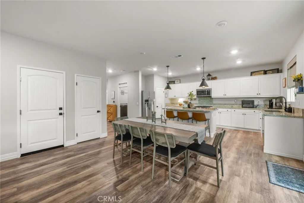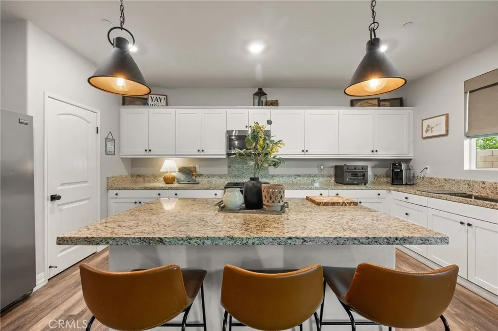 Beautiful two-story home with wonderful curb appeal and a spacious, open-concept layout. The inviting kitchen features upgraded appliances, pendant lighting, a large center island with bar seating, and opens seamlessly to the dining area and family roomcreating the perfect space for everyday living and entertaining. The thoughtfully designed floor plan includes a downstairs bedroom and full bathroom, ideal for guests, multi-generational living, or a home office. Upstairs offers a spacious loft, two additional bedrooms, a full bathroom, and a generous primary suite featuring two walk-in closets and an ensuite bath with dual sinks and a large walk-in shower. Recent improvements include upgraded flooring with new baseboards, fresh interior paint, ceiling fans throughout, SunTex window screens, upgraded kitchen appliances, and a water softener system. The backyard is designed for both relaxation and entertaining with a covered patio, extended concrete patio space, built-in fire feature, grassy yard with underground irrigation, and thoughtful landscaping. Additional highlights include owned solar, epoxy garage flooring, and garage storage. This wonderful home offers a functional floor plan, numerous upgrades, and inviting indoor-outdoor living spaces.