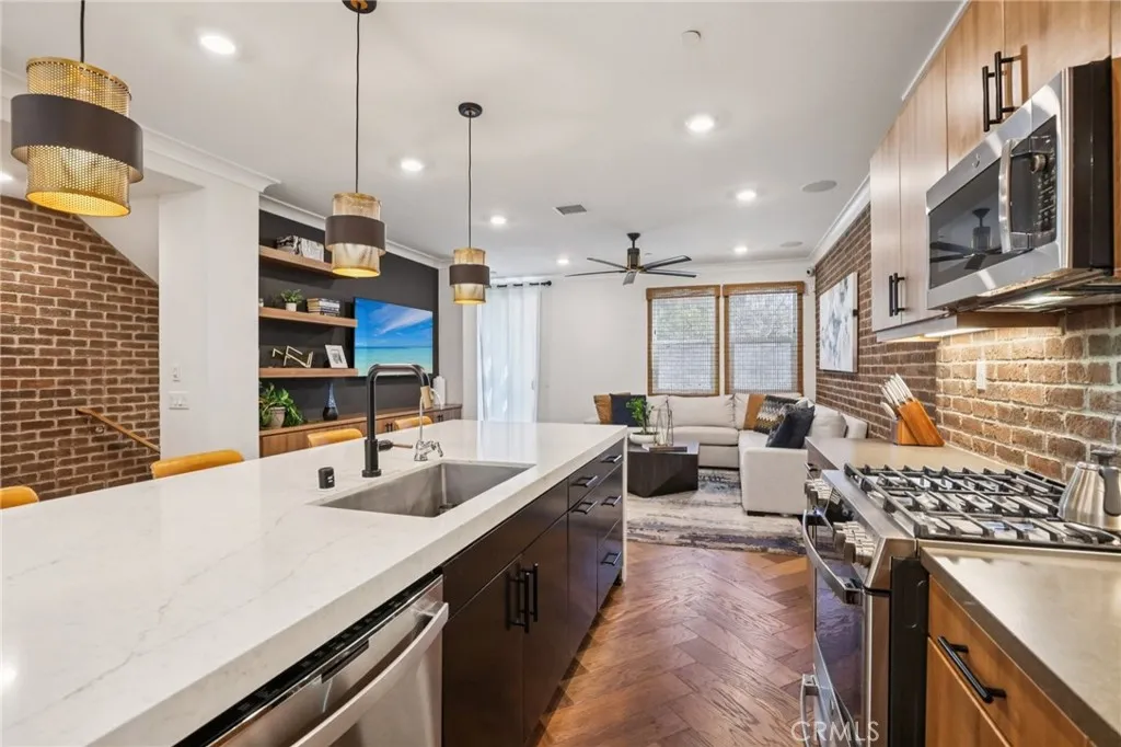 FORMER MODEL HOME in the prestigious ParkerOne community by TRI Pointe Homes in Orange. Thoughtfully curated with designer upgrades throughout, this stunning residence is the perfect blend of modern elegance and everyday luxury. Enter through the covered porch and foyer, youll be captivated by earth-tone herringbone hardwood floors, custom window coverings, crown molding, and sleek surface-mount LED lighting. The main level offers a versatile den with a custom-built-in bookcase, floating shelves, wall sconces, and a quartz countertop along with a beautifully appointed powder room featuring a pedestal sink, framed mirror, and full-height custom tile. Make your way upstairs to the heart of the home: an open-concept living and entertaining level designed to impress. The chefs kitchen is a showstopper, featuring quartz countertops with a full brick backsplash, a waterfall-edge island tiled at the face, shaker cabinetry in Graphite Nero, a Brizo matte black and luxe gold faucet, and premium stainless steel appliances. A walk-in pantry, guest powder room, and a private deck. The dining area and living room continue the sophisticated aesthetic with Lausanne flat-panel cabinetry, brick wall treatments, decorative pendant lighting, a built-in media cabinet with floating shelves, and a modern ceiling fan. The striking open-rail staircase stain-grade with metal tubular balusters and brick wall accents leads to the top floor, where the primary suite awaits soaring wood beam ceilings, gold-finish pendant lighting. Dual vanities with quartz countertop and full-height tile backsplash,