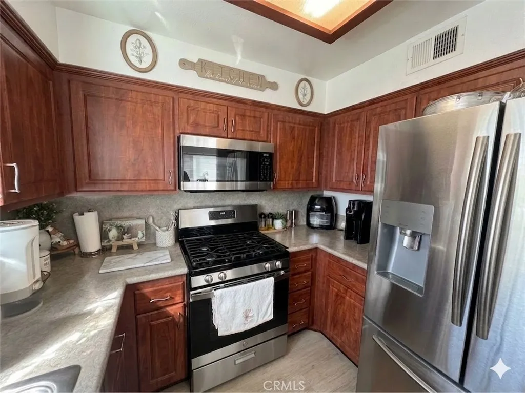 Well-maintained end-unit 2-bedroom, 1.5-bath condo offering 1,254 sq ft of comfortable living space in a desirable Ontario community. This two-level home features an open living and dining area with abundant natural light, enhanced by vaulted ceilings and a cozy fireplace in the living room, creating an inviting and spacious feel. Dual-pane windows and laminate flooring add to the homes clean and functional design. The kitchen has been updated with stainless steel appliances and upgraded cabinetry. Both bedrooms are generously sized, including a primary bedroom with its own en-suite bathroom, offering added privacy and convenience. The private patio provides a great space for outdoor seating or relaxing. An attached 2-car garage with laundry hookups offers direct access and everyday convenience. Community amenities include a pool and spa, and HOA dues cover water, sewer, trash, and community patrol services. Conveniently located near shopping, dining, and major freeways, this home offers a well-balanced combination of comfort, layout, and location; ideal for first-time buyers, downsizers, or investors.