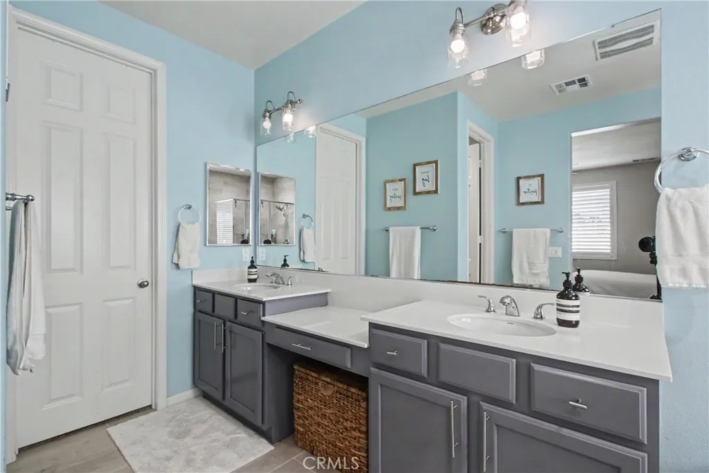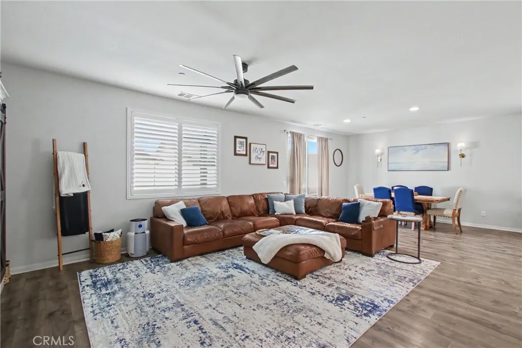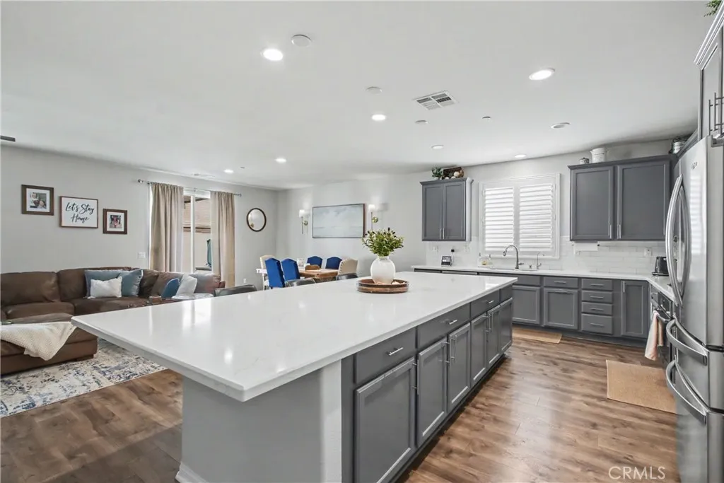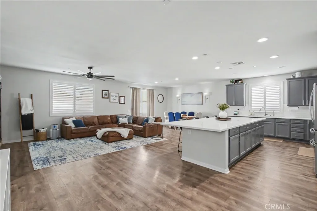 Welcome to this beautifully upgraded 5-bedroom, 3.5-bathroom home located in the highly desirable community of Spencer's Crossing in Murrieta. Step inside to find elegant plantation shutters throughout and durable luxury vinyl plank (LVP) flooring in the main living areas, with plush carpeting in the bedrooms for added comfort. The heart of the home is the expansive, chef-inspired kitchen, complete with Corian countertops, an impressive 15-foot center island, custom cabinetry, soft-closing drawers, built-in trash bin, and a large walk-in pantry. Additional highlights include a single oven and a convenient double sink with touch featureideal for both everyday living and entertaining. The backyard is designed for relaxation and gatherings, featuring a covered patio with ceiling fans and shades, a gas line for outdoor cooking, low-maintenance vinyl fencing, and newly installed sod. The front yard offers attractive and water-efficient artificial turf. Additional upgrades include: 2-car garage with epoxy flooring, Tankless water heater, Tesla charging station, Water softener system, Paid-off solar system for energy efficiency and savings This home truly combines comfort, style, and sustainabilitydont miss the opportunity to make it yours!