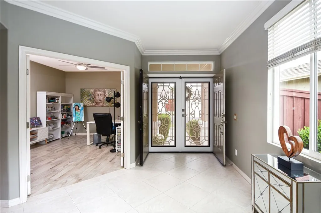 Four Seasons is a Premier 55+ master planned community with unparalleled activities and amenities. Contemporary, light and welcoming epitomize the feeling of this spacious two bedroom two bath home with 2021 sq. ft. and two car garage. The versatile floor plan offers a third room to suit your lifestyle, whether you need an office, art studio or guest room. Nestled on a quiet cul-de-sac, double door entry w/ custom security screen doors, primary en suite offers 2 walk in closets, high ceilings, light wood look tile floors, updated lighting and ceiling fans, floor to ceiling stack stone faced F/P, granite kitchen, all appliances included, crown molding, covered patio, fully landscaped. Water softener system, updated light fixtures, faux wood blinds. Resort style living, HOA $214.00. gated community with attendant, roving 24 hour security. Come experience fulfilling clubs and fun filled events or just luxuriate at the gorgeous pool. The privately owned golf course of Hemet Golf Club winds gracefully throughout the community adding to the natural beauty of the landscape.