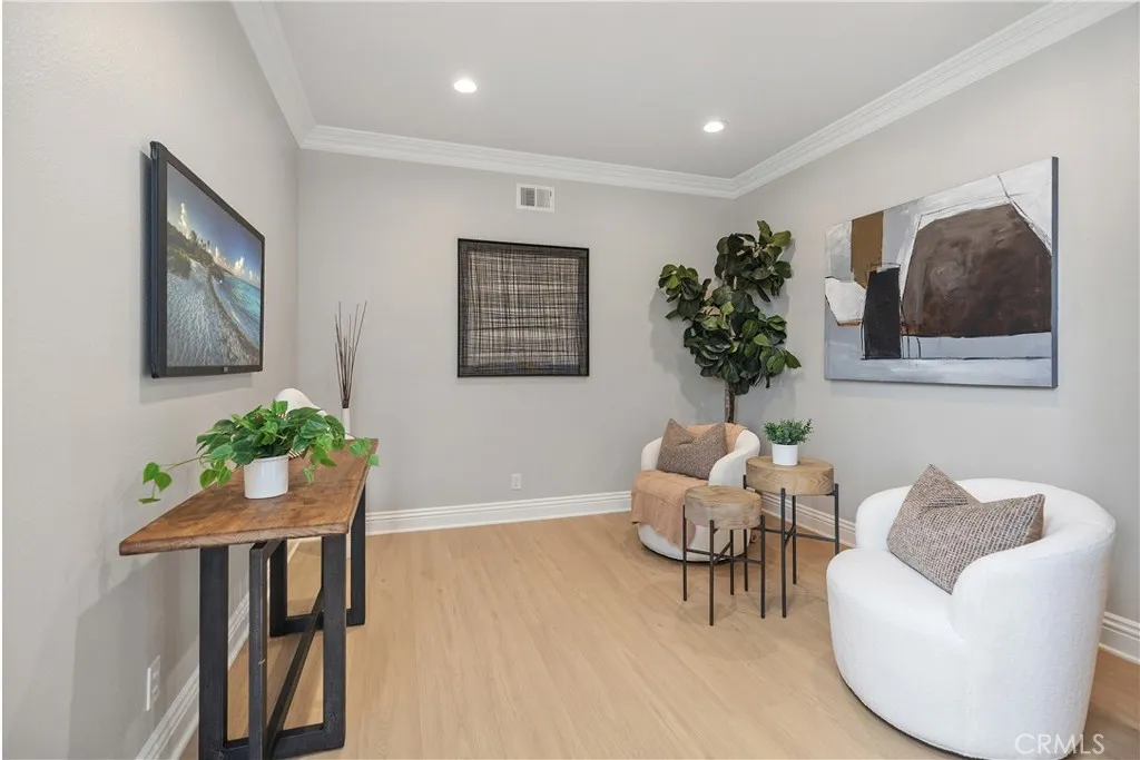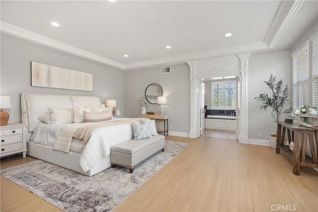 Step into this stunning Northpark residence, where elegance meets comfort. Boasting 4 spacious bedrooms and 2.5 beautifully appointed bathrooms, this home features new laminate flooring and crown molding throughout, creating a seamless and polished look. The gourmet kitchen is a chefs dream, featuring pristine white cabinetry, luxurious quartz countertops, a walk-in pantry, and designer recessed lighting, flowing effortlessly into the inviting family room with a warm fireplace. The home also offers a separate living room, while the dining room opens to the backyard, which showcases Graystone flooring perfect for entertaining. Custom window shutters enhance the homes refined appeal throughout. The primary suite is a private retreat, complete with double doors, a serene balcony, a spacious walk-in closet with built-ins, and a spa-inspired bath with a walk-in shower, separate soaking tub, and dual sinks. Three secondary bedrooms share a well-designed hall bathroom with dual sinks and a shower-over-tub. Two bedrooms feature walk-in closets with built-ins, and one is currently set up as a stylish home office with double doors. Enjoy access to a wealth of amenities, including 5 swimming pools, 6 parks, 3 tot lots, a clubhouse, a full basketball court, 2 half courts, and 3 tennis courts. It is also just a 5-minute walk from Hicks Canyon Elementary School. This home is designed for both comfort and elegance, making it the perfect place for you and your family. Additional features include a direct 2-car garage, a convenient first-floor laundry room, and abundant storage throughout.