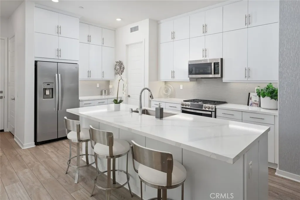 Absolutely stunning and rare 3 bed, 2 bath ground floor SINGLE STORY home in the highly sought after Rowan collection in Valencia's coveted FivePoint community. Beautifully appointed modern home featuring an open-concept floor plan with high ceilings, large picture windows, luxury vinyl plank flooring, and tons of designer upgrades. Can be purchased fully furnished! Step inside to the large living room bathed in natural light with views of the lovely courtyard through the oversized picture windows. The bright and airy living area flows seamlessly into the dining space featuring a beautiful feature wall and eye-catching chandelier. The gourmet kitchen is an entertainer's dream, showcasing quartz countertops, a huge island, designer backsplash, beautiful white cabinetry with brushed nickel hardware, a walk-in pantry, and high end stainless-steel appliances. From the kitchen, step through sliding glass doors to the charming and spacious covered courtyard - perfect for relaxing or outdoor get togethers. The primary suite offers plush carpeting, recessed lighting, custom window coverings, a generous walk-in closet, and a luxurious en-suite bathroom with dual quartz vanities and a walk-in shower. Two additional bedrooms include large closets, custom window coverings and abundant natural light. The full guest bath also features dual vanities, quartz counters, and a tub/shower combination. Additional highlights include a dedicated laundry room, attached two-car garage, EV charger and owned solar panels for enhanced energy efficiency. Residents of the FivePoint community enjoy resor