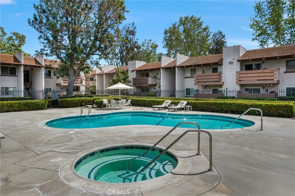 Welcome home! This move-in ready second-floor unit offers the privacy of having no neighbors above and beautiful pool views from the primary suite. The freshly painted, open-concept living space is complemented by stainless steel appliances, a walk-in closet, and central heating and air conditioning. A designated garage parking space adds everyday convenience. Ideally located between three major freeways, this home provides easy access to nearby parks, restaurants, and schools. The well-maintained community features a variety of amenities, including a pool and spa, community room, outdoor shower, tennis courts, and more making it a perfect place to live and relax.