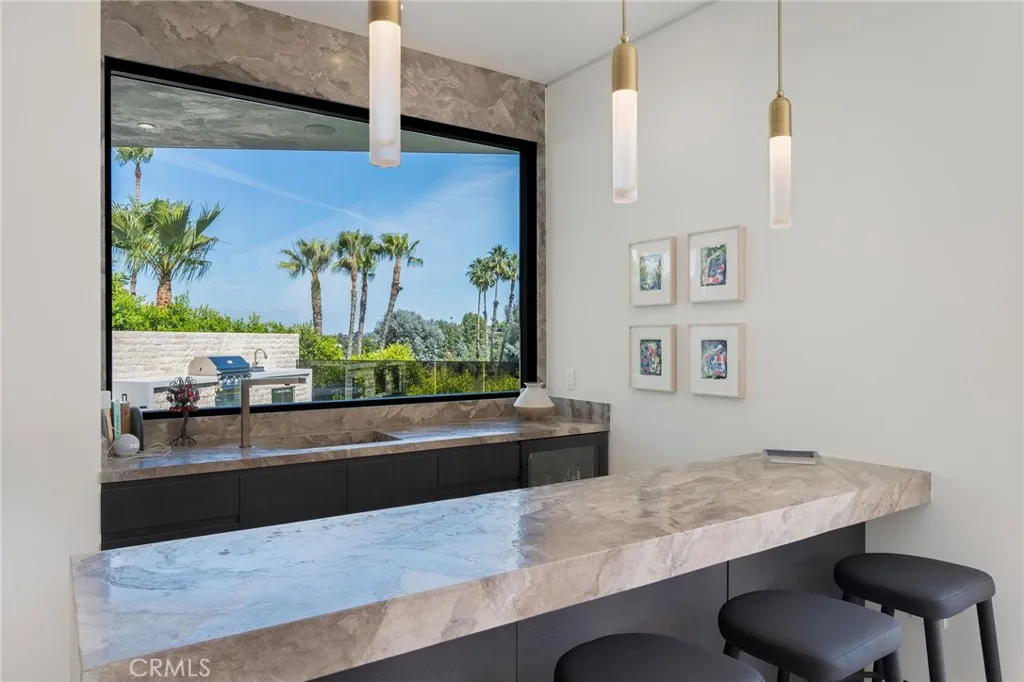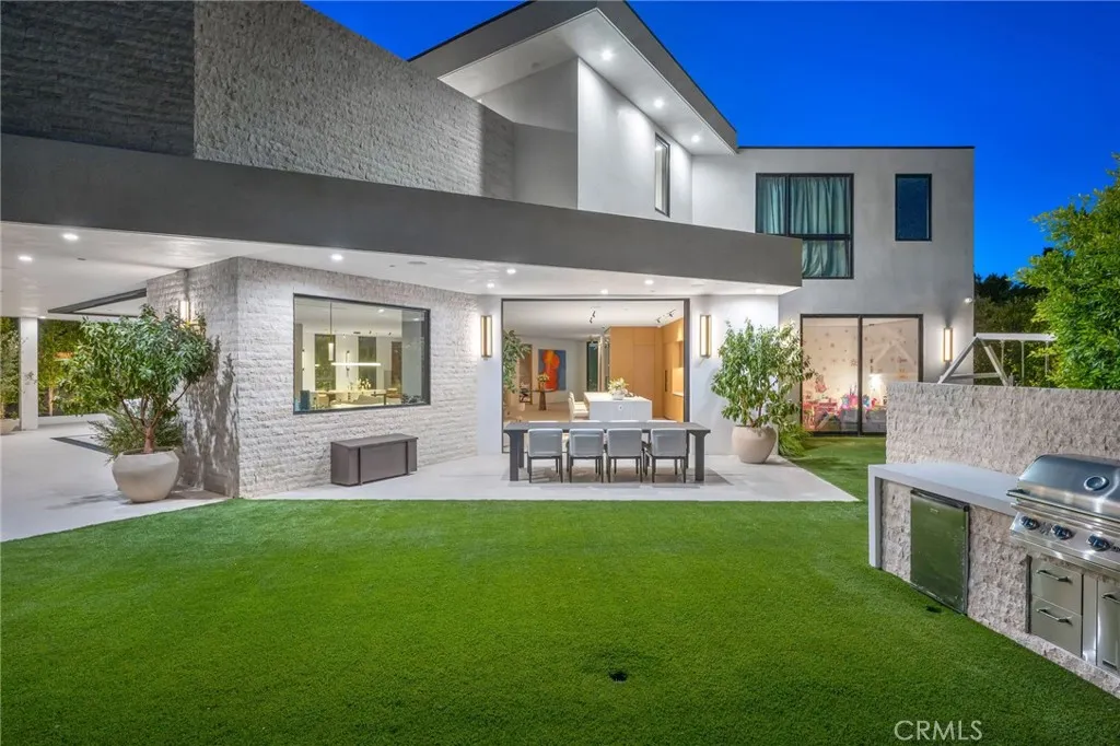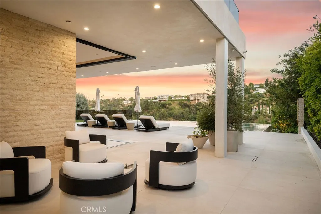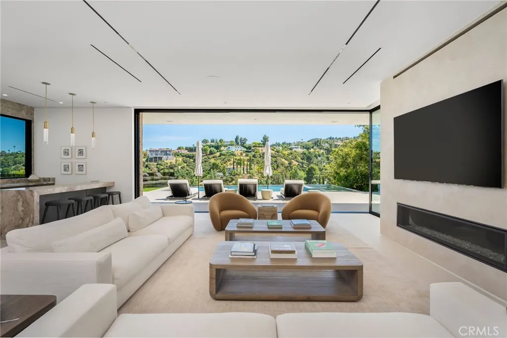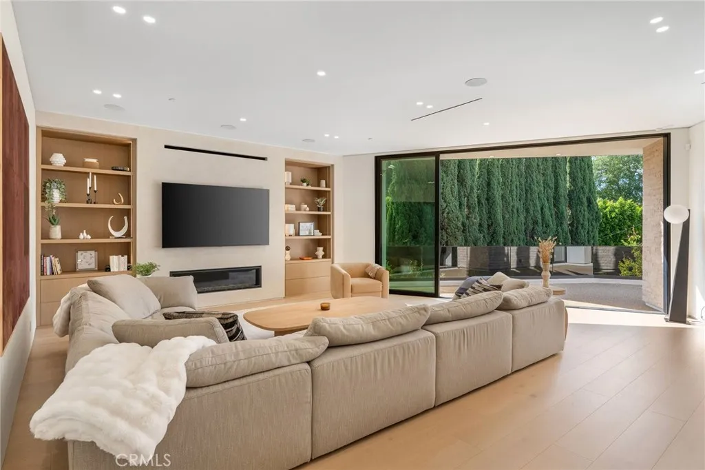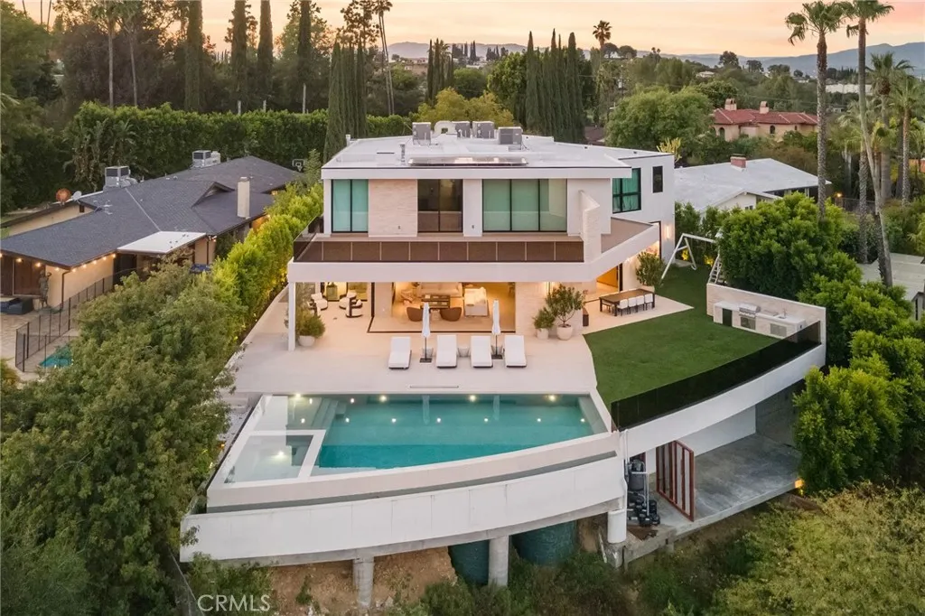Welcome to your captivating newer construction modern masterpiece with incredible views, located South of the Blvd in Encino. Located on a flag lot set behind large private gates, sits this grand estate perched above boasting approx. 7,977 sqft of refined luxury. Awe inspiring main level welcomes you to quintessential indoor outdoor California living. Incredibly open floor plan generates a smooth flow from the sweeping through the dining room to with glass enclosed wine display, family room with stone fireplace, chefs kitchen with large center island, walk in pantry pantry, bedroom with en-suite bathroom, Media room and patio overlooking the ultimate entertainer's dream backyard. Upstairs beholds an upstairs living room complete with fireplace, 3 exquisitely designed en-suite bedrooms perfect for family and friends. The romantic master retreat features a stunning fireplace, expansive walk-in closet, luxurious spa-like bathroom, and glass sliding doors leading out to the extensive balcony with incredible views. The entertainers backyard showcases a covered patio deck with outdoor fireplace, outdoor kitchen, dedicated gym area under the pool, and large pool and spa with infinity edge. Additional conveniences include Control4 smart home automation system and high tech security. Architecturally designed with meticulous perfection, this trophy estate is unlike any other. Close to the best shops, fine dining and many more.