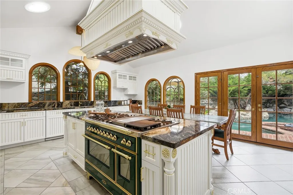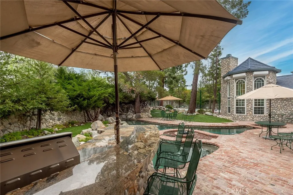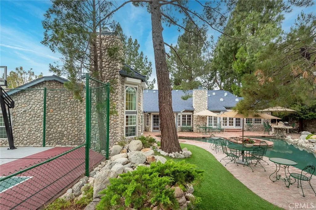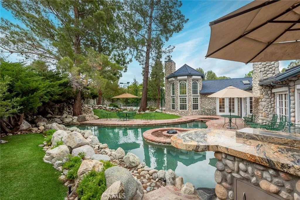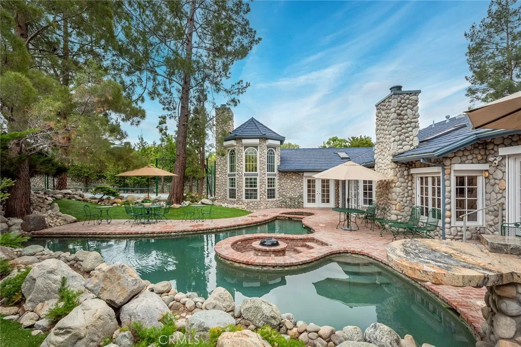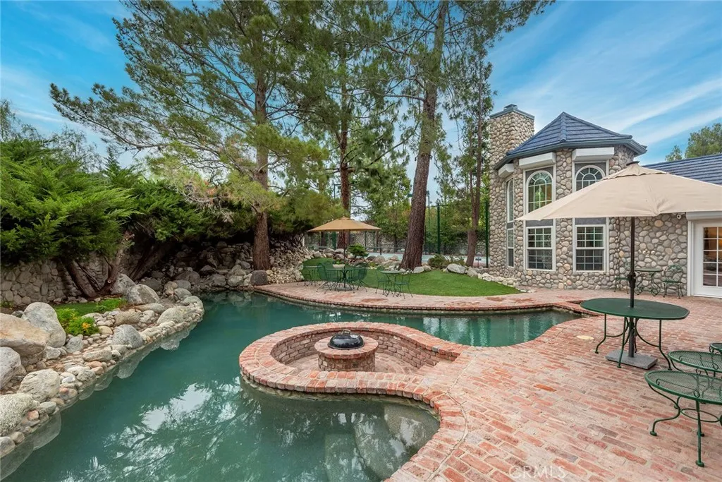 Custom Lake Tahoe-inspired single-story estate set in the prime Granada Highlands on a whisper-quiet street, this rare architectural showpiece captivates from the moment you arrive. A storybook cobblestone exterior is highlighted by a dramatic turret-style design with soaring arched windows, creating an unforgettable first impression. Set beneath mature pine trees, the home is framed by lush landscaping and a brick driveway that enhances its warmth and character. The custom stone faade is complemented by rich wood garage doors with designer hardware, while a gated entry adds privacy and a true sense of arrival. Designed for both entertaining and everyday living, the home features soaring ceilings, expansive windows, and warm acacia wood flooring throughout. The floor plan offers multiple living spaces, including a spacious family room with exposed beams and a stunning river rock fireplace, a formal dining area filled with natural light, and a private office with double-door entry. At the heart of the home is a chef-inspired kitchen with a custom ILVE Italian range, secondary Zephyr cooktop, built-in refrigerator, wine cooler, and extensive custom cabinetry. Granite countertops, skylights, and French doors create a bright space with seamless indoor-outdoor flow. A standout feature is the custom octagon bar room with two-story windows, solid oak bar, and unique architectural detailsideal for entertaining. The adjacent pool parlor offers high ceilings, skylights, and a dramatic river rock fireplace. The home features two primary suites, each offering a private retreat. The ori