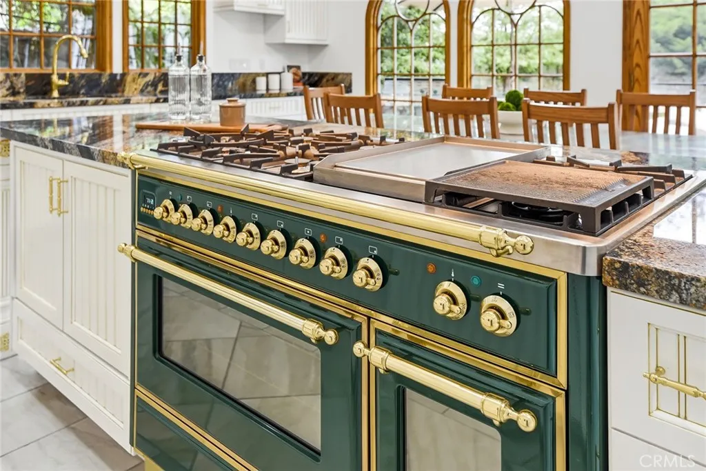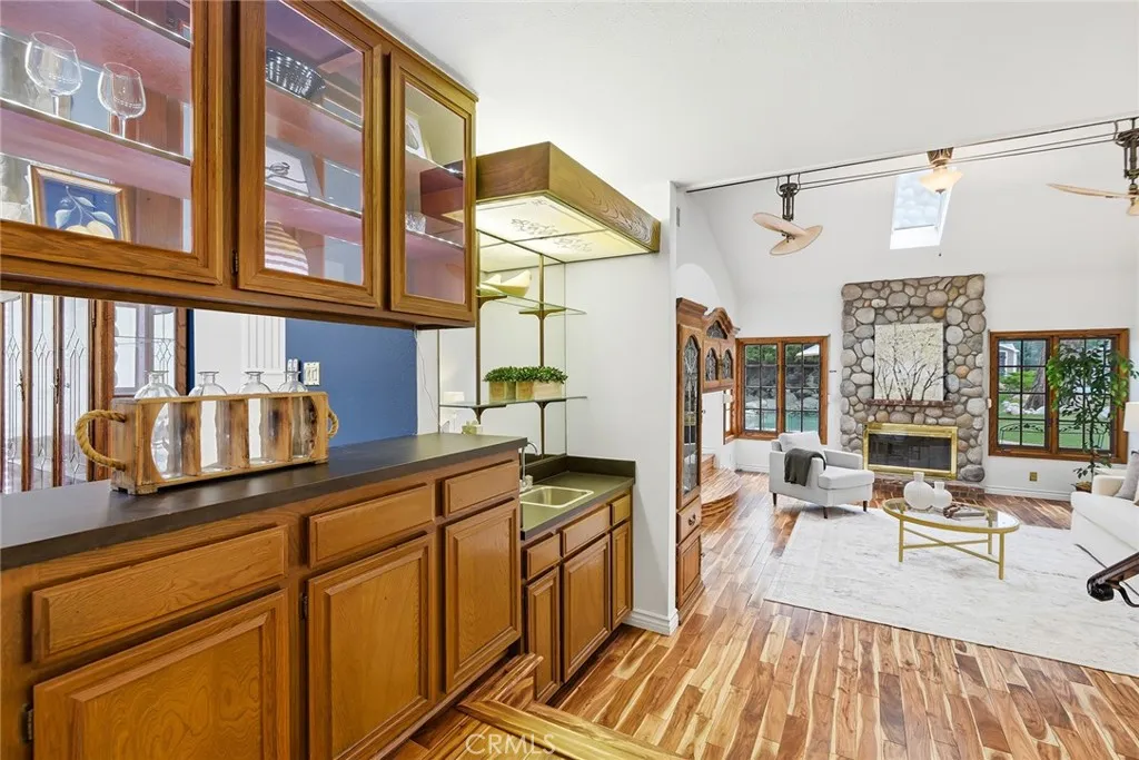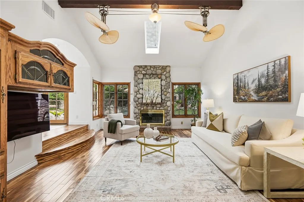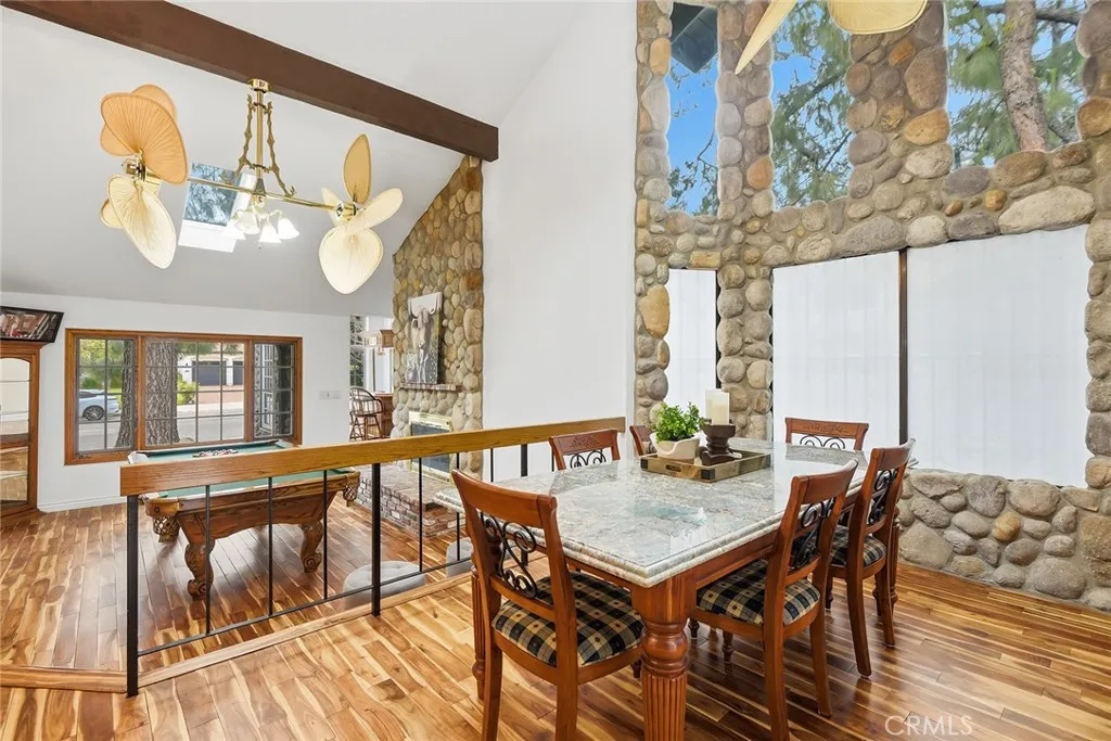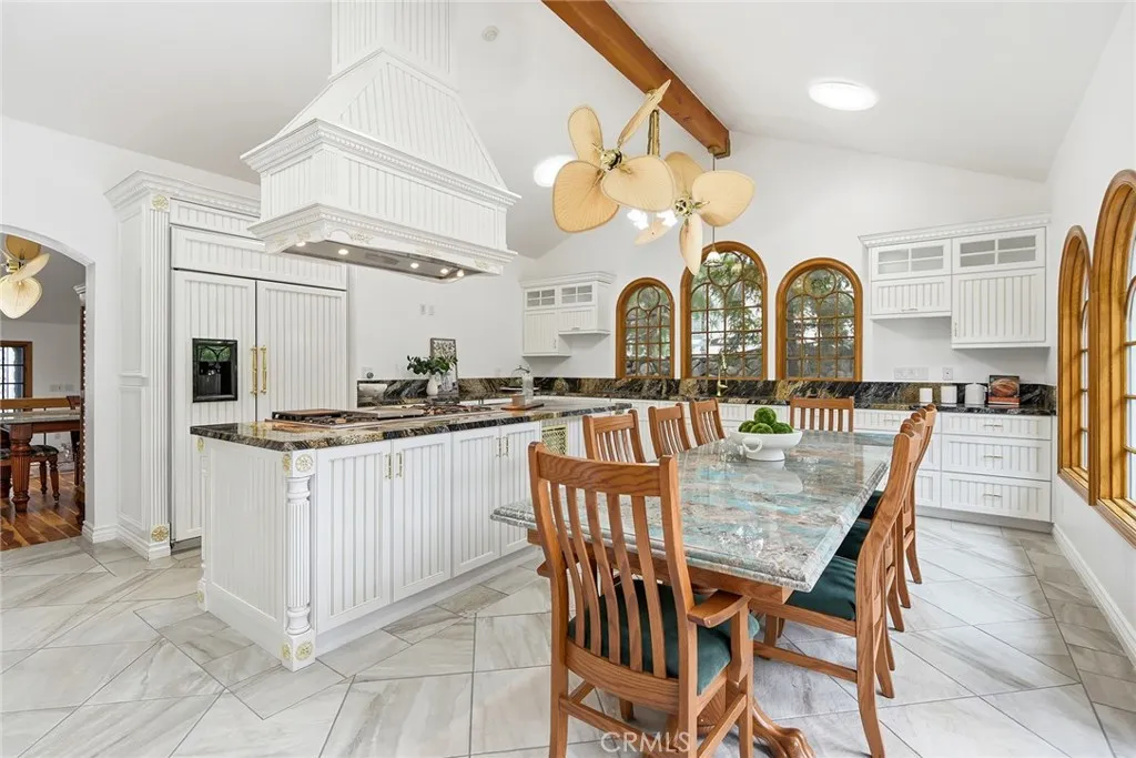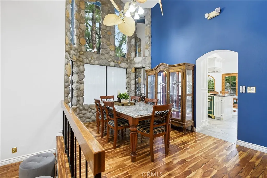 Custom Lake Tahoe-inspired single-story estate set in the prime Granada Highlands on a whisper-quiet street, this rare architectural showpiece captivates from the moment you arrive. A storybook cobblestone exterior is highlighted by a dramatic turret-style design with soaring arched windows, creating an unforgettable first impression. Set beneath mature pine trees, the home is framed by lush landscaping and a brick driveway that enhances its warmth and character. The custom stone faade is complemented by rich wood garage doors with designer hardware, while a gated entry adds privacy and a true sense of arrival. Designed for both entertaining and everyday living, the home features soaring ceilings, expansive windows, and warm acacia wood flooring throughout. The floor plan offers multiple living spaces, including a spacious family room with exposed beams and a stunning river rock fireplace, a formal dining area filled with natural light, and a private office with double-door entry. At the heart of the home is a chef-inspired kitchen with a custom ILVE Italian range, secondary Zephyr cooktop, built-in refrigerator, wine cooler, and extensive custom cabinetry. Granite countertops, skylights, and French doors create a bright space with seamless indoor-outdoor flow. A standout feature is the custom octagon bar room with two-story windows, solid oak bar, and unique architectural detailsideal for entertaining. The adjacent pool parlor offers high ceilings, skylights, and a dramatic river rock fireplace. The home features two primary suites, each offering a private retreat. The ori