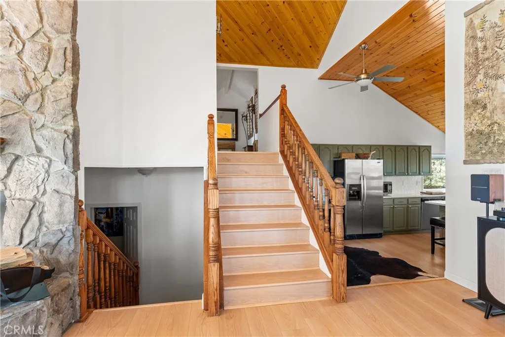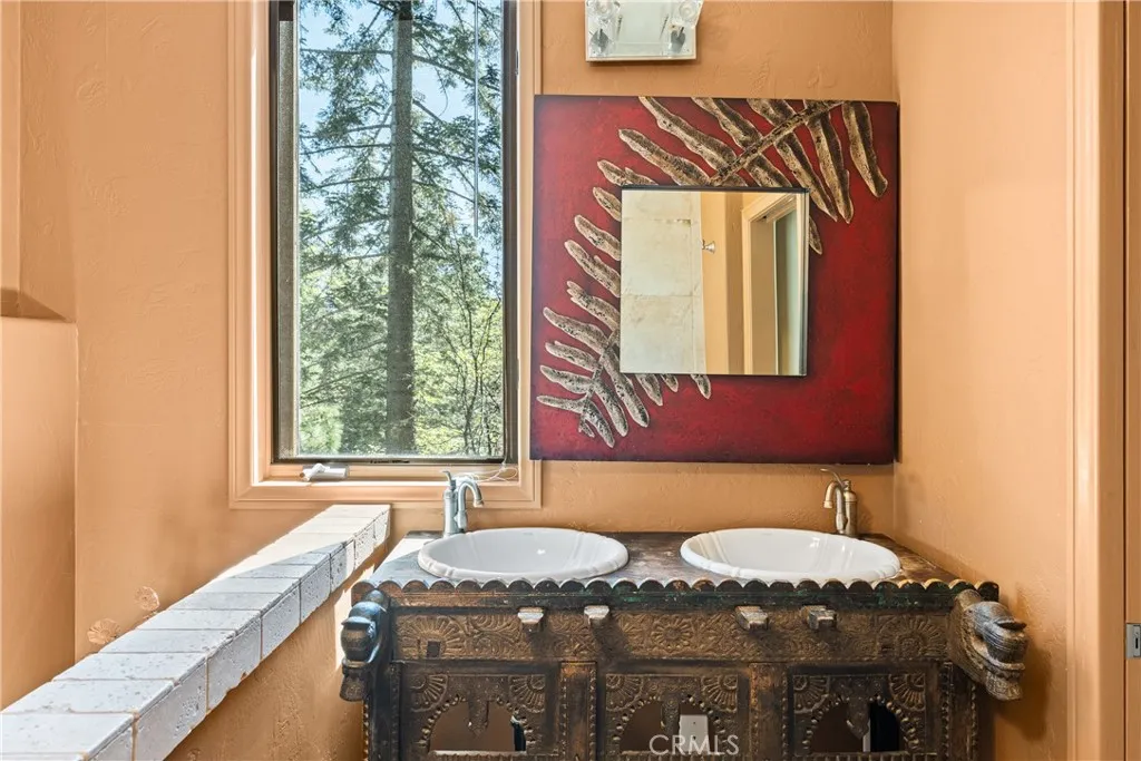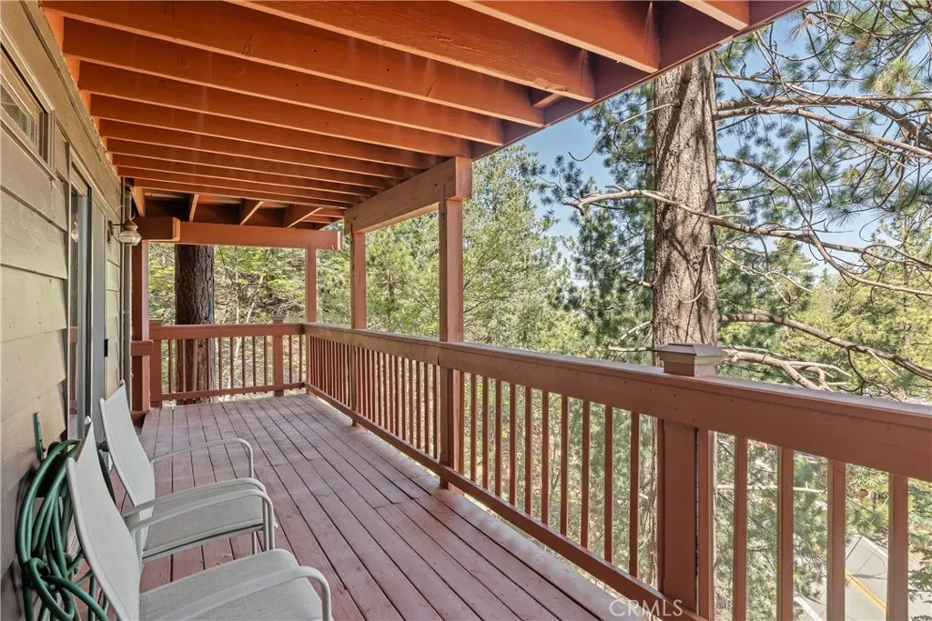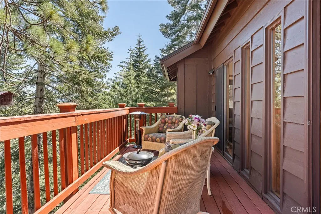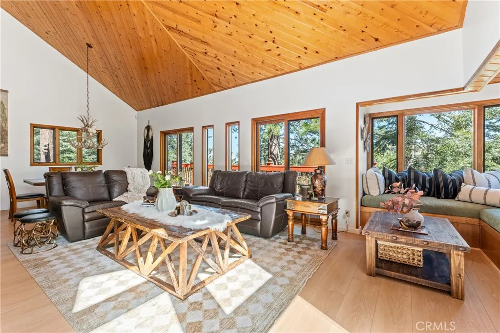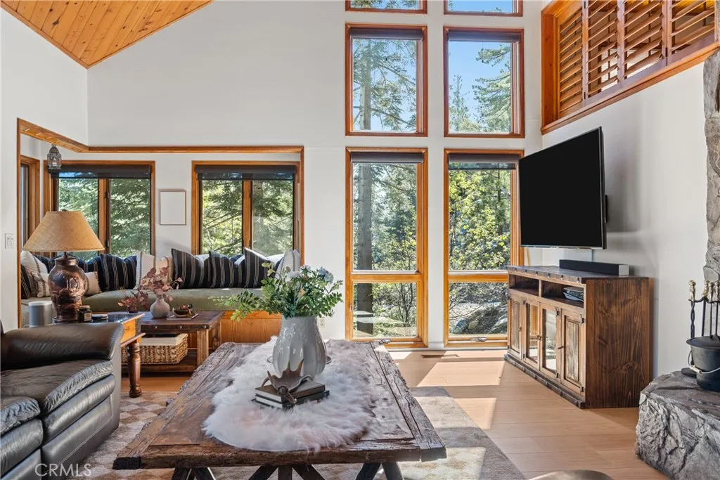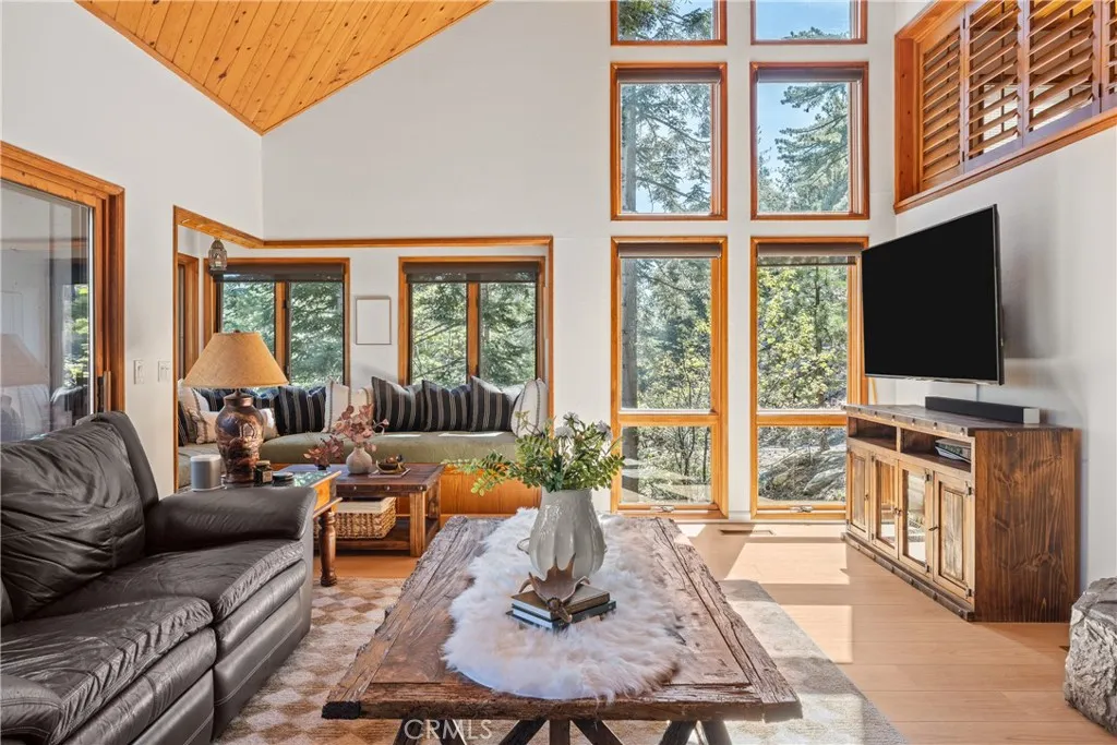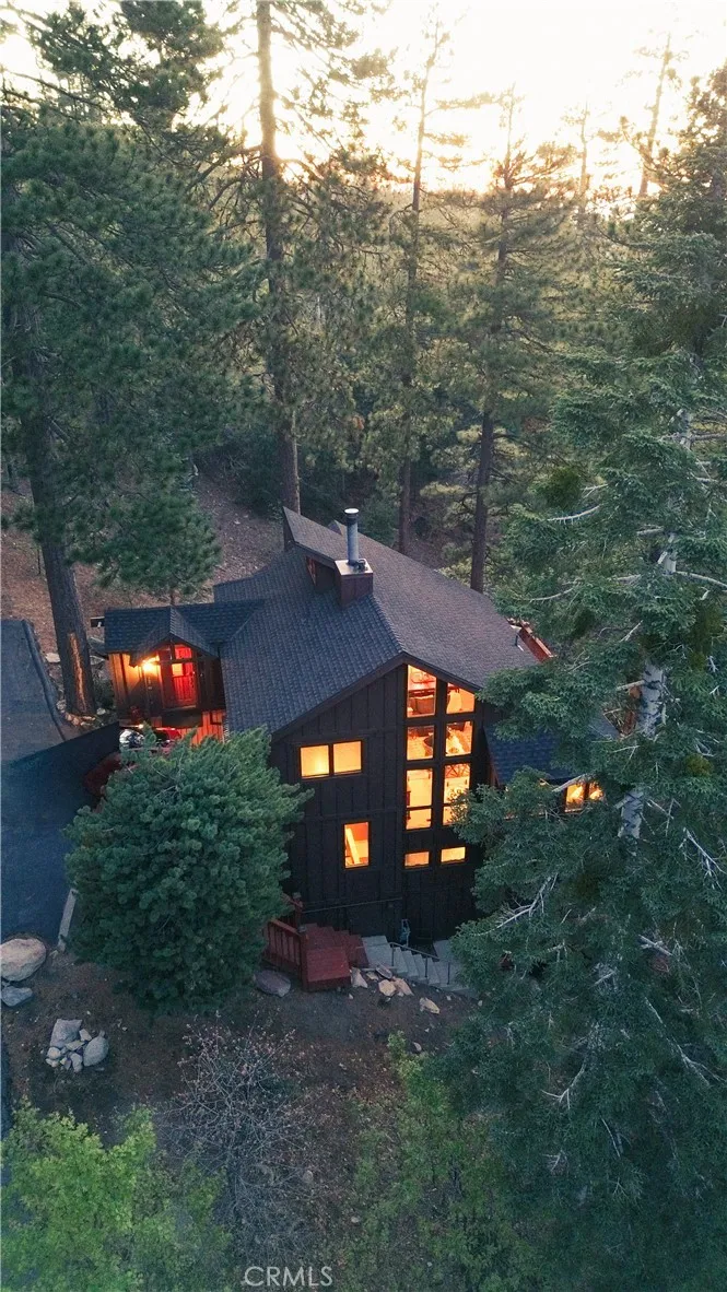 Lake Rights, level entry, and a rare private setting - this mountain retreat offers a unique sense of seclusion in Lake Arrowhead. Tucked away on a private road and surrounded by dramatic boulders and towering pines, this striking mountain home presents breathtaking ridge-line vistas. Thoughtfully designed to embrace its natural setting, the home features a unique, multi-level layout with soaring vaulted ceilings and an open-concept flow that invites both relaxation and connection. The entry level welcomes you with a charming foyer, a comfortable bedroom, and a bathroom - ideal for guests or easy main-level living. The heart of the home unfolds on the middle level, where a spacious living room is anchored by a wall of glass that brings the forest into your living room. A wood-burning fireplace adds warmth and ambiance, while a rare conversation nook creates the perfect space to gather and unwind. The light-filled kitchen has been tastefully updated and flows seamlessly into the dining area, with a nearby 3/4 bathroom to make every day hosting and living easy. Direct access to an expansive wrap-around deck offers a true treehouse experience with sweeping mountain views. The lower level provides two private bedroom suites, each with its own en-suite bathroom and access to a second deck, creating another peaceful retreat immersed in nature. Additional highlights include a whole-home automatic generator, air conditioning, fiber internet, updated flooring throughout, multiple parking areas, and dual access from both Fairway Dr or the private road. Located just minutes from the p