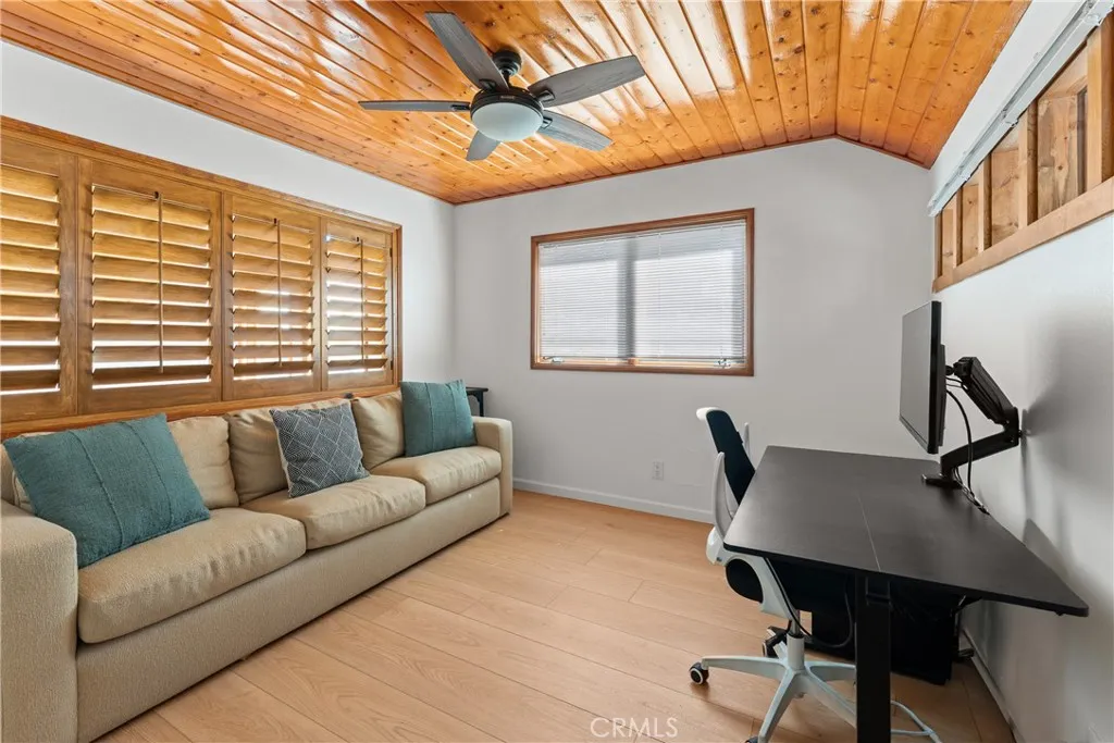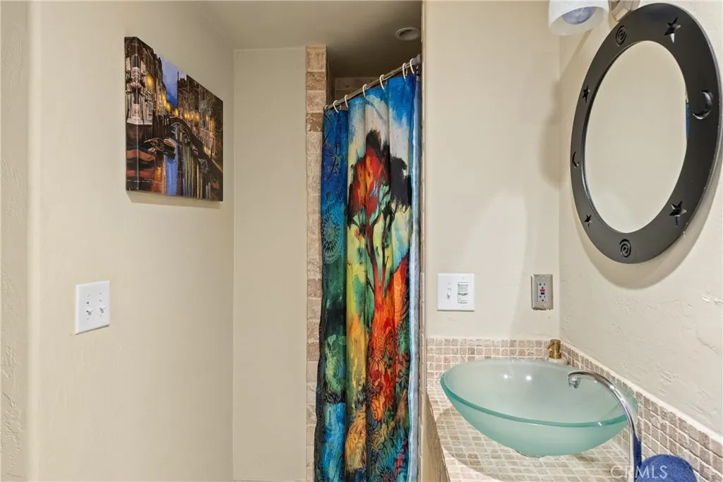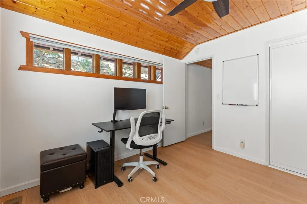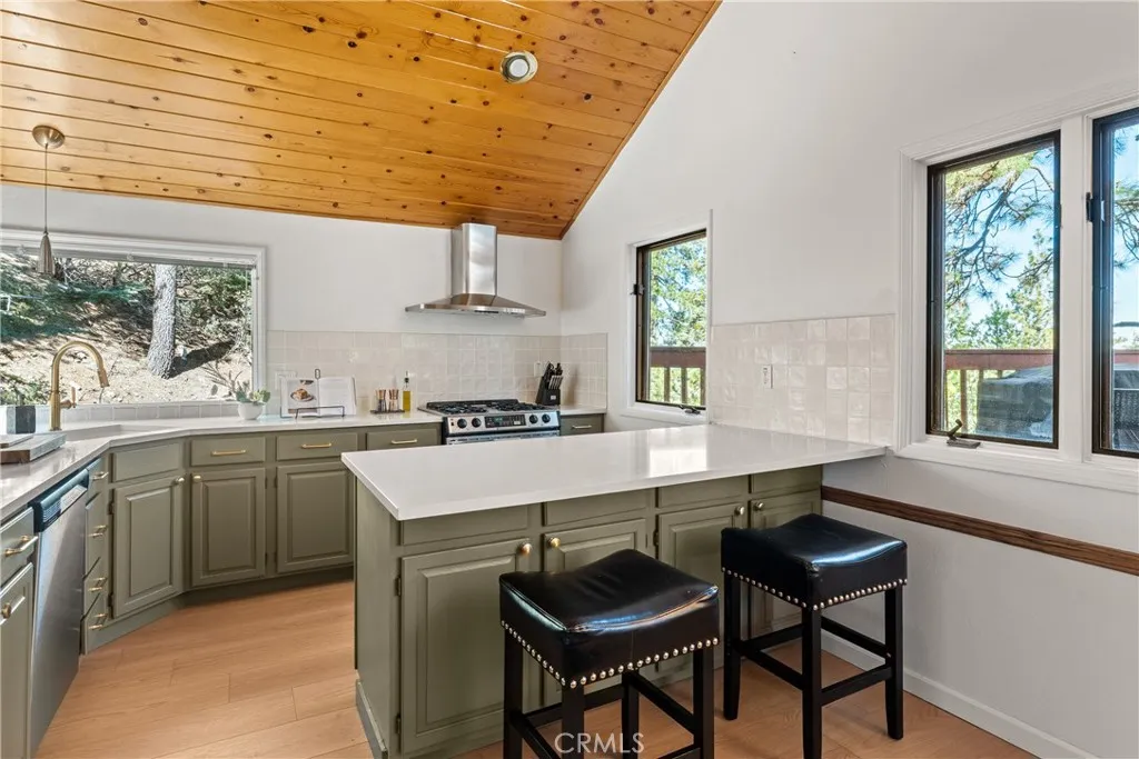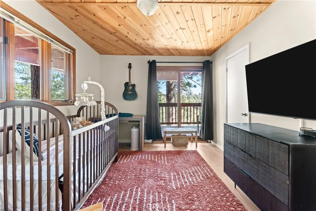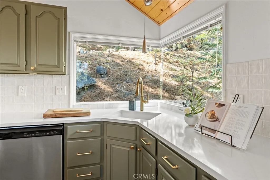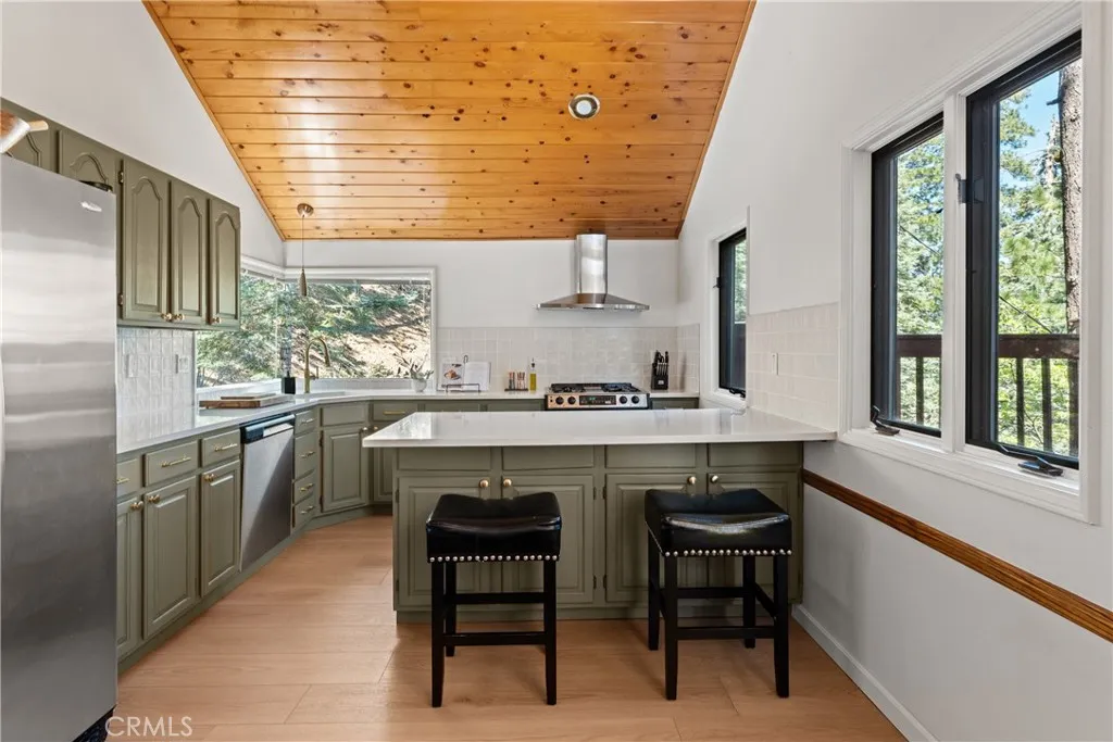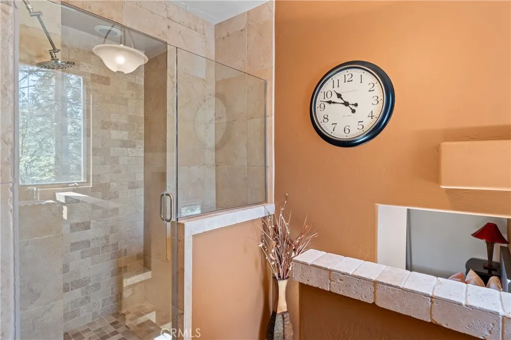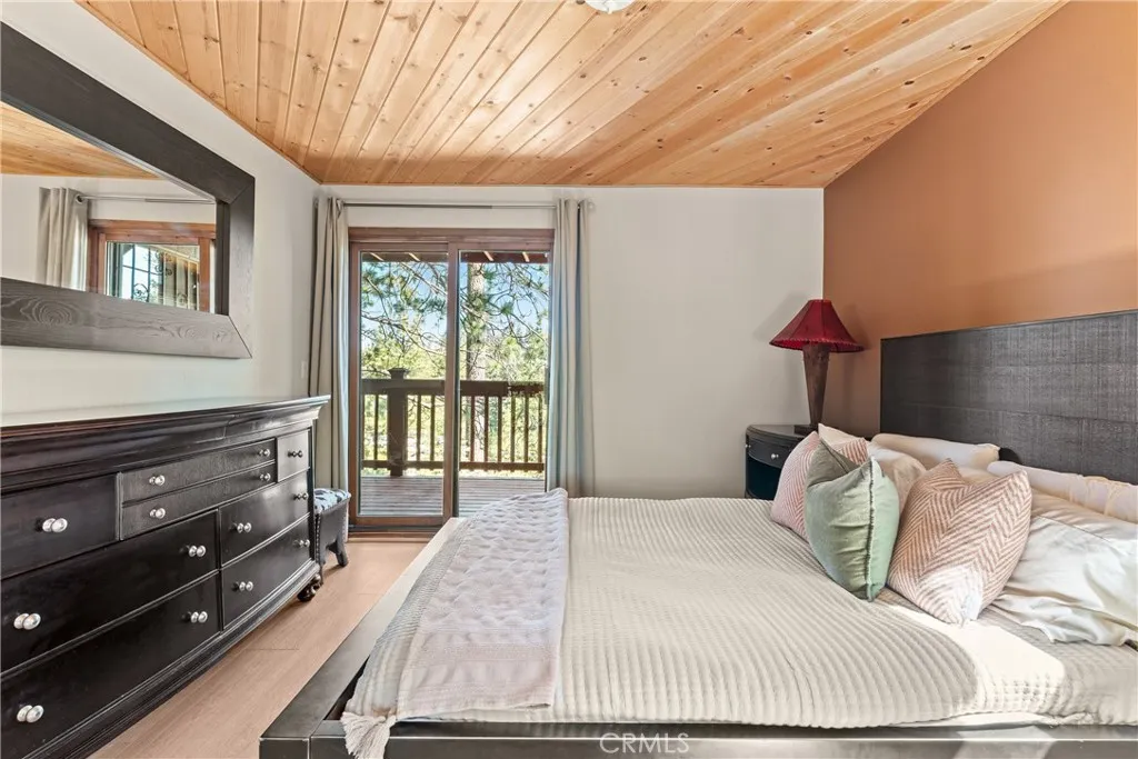 Lake Rights, level entry, and a rare private setting - this mountain retreat offers a unique sense of seclusion in Lake Arrowhead. Tucked away on a private road and surrounded by dramatic boulders and towering pines, this striking mountain home presents breathtaking ridge-line vistas. Thoughtfully designed to embrace its natural setting, the home features a unique, multi-level layout with soaring vaulted ceilings and an open-concept flow that invites both relaxation and connection. The entry level welcomes you with a charming foyer, a comfortable bedroom, and a bathroom - ideal for guests or easy main-level living. The heart of the home unfolds on the middle level, where a spacious living room is anchored by a wall of glass that brings the forest into your living room. A wood-burning fireplace adds warmth and ambiance, while a rare conversation nook creates the perfect space to gather and unwind. The light-filled kitchen has been tastefully updated and flows seamlessly into the dining area, with a nearby 3/4 bathroom to make every day hosting and living easy. Direct access to an expansive wrap-around deck offers a true treehouse experience with sweeping mountain views. The lower level provides two private bedroom suites, each with its own en-suite bathroom and access to a second deck, creating another peaceful retreat immersed in nature. Additional highlights include a whole-home automatic generator, air conditioning, fiber internet, updated flooring throughout, multiple parking areas, and dual access from both Fairway Dr or the private road. Located just minutes from the p