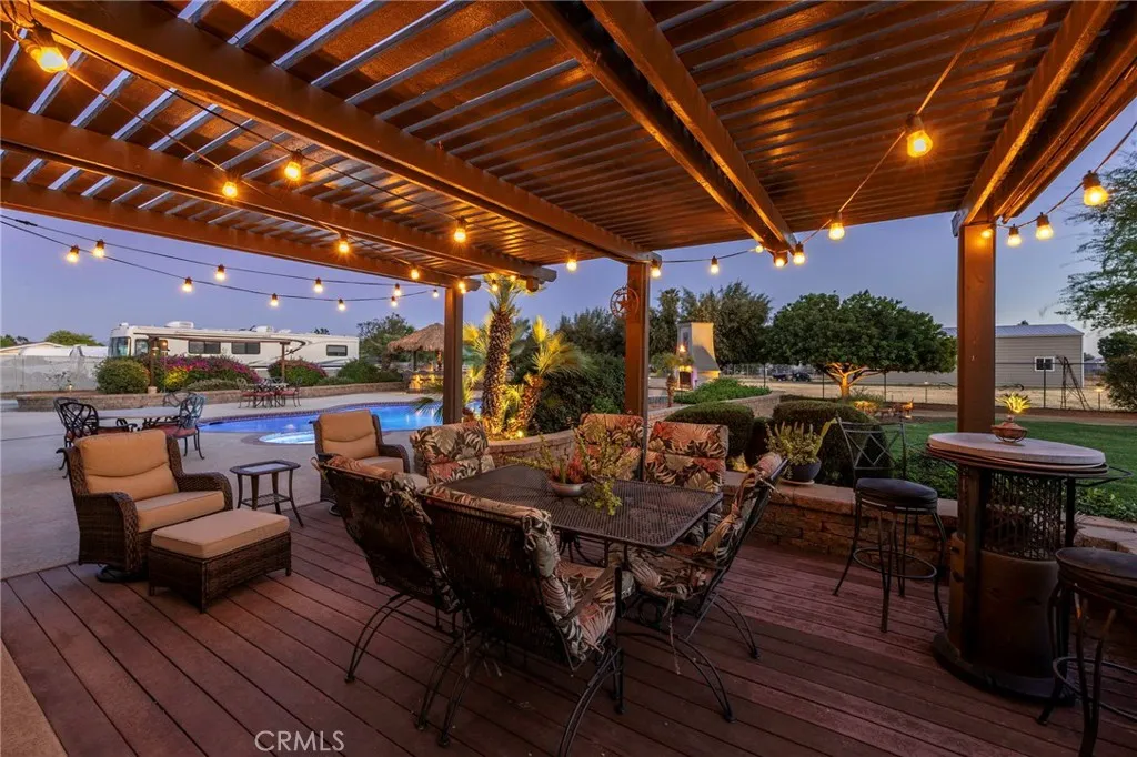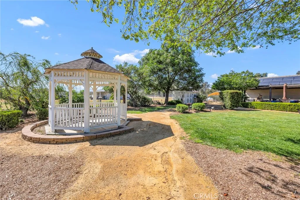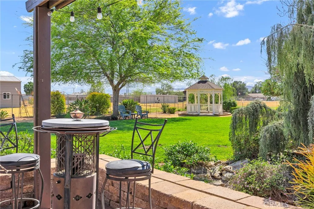 Welcome to a rare opportunity in the heart of Menifee2 HOMES on one beautifully maintained 2.26-acre lot, offering the perfect blend of luxury, functionality, and versatility. Whether youre seeking multi-generational living, rental income, or space for your ranch lifestyle, this exceptional property delivers. The main residence is a single-story ranch-style home offering approximately 2,459 sq. ft., featuring 4 bedrooms and 2.5 baths. Inside, youll find a large formal living room with an adjoining dining room, ideal for gatherings, along with a warm and inviting family room with wood-beamed ceilings and a wood-burning fireplace. The kitchen is filled with natural light and offers abundant cabinetry, granite countertops, and a charming breakfast nookblending classic ranch style with everyday functionality. The spacious primary suite offers direct access to the pool, while the updated primary bath provides a spa-like retreat with a beautifully designed shower. Three additional guest bedrooms and a full bath complete the home. Additional highlights include a 3-car garage, paid-off solar, and a 700-ft deep well. The grounds are thoughtfully designed with professional landscaping and outdoor lighting, creating a private resort-style setting. Enjoy endless entertaining with a sparkling pool and spa, expansive covered patio, gazebo, and an outdoor kitchen complete with bar seating and a charming palapa cover. Additional features include an 28x48 RV garage, separate RV/trailer parking with gated access, storage shed, and ample space for animals. The property is fenced and crossed f