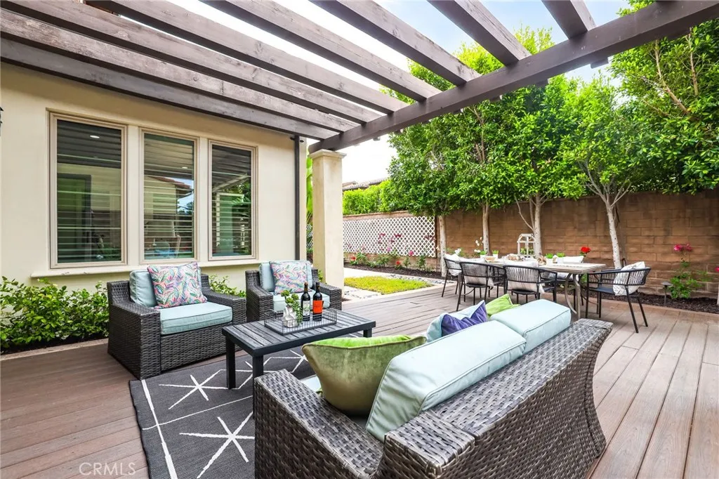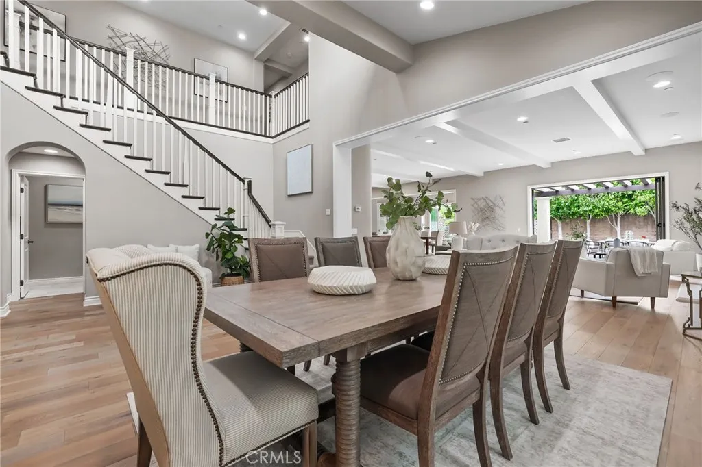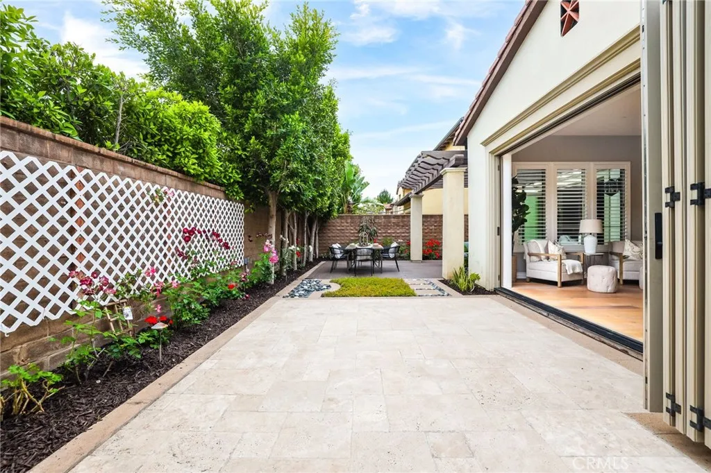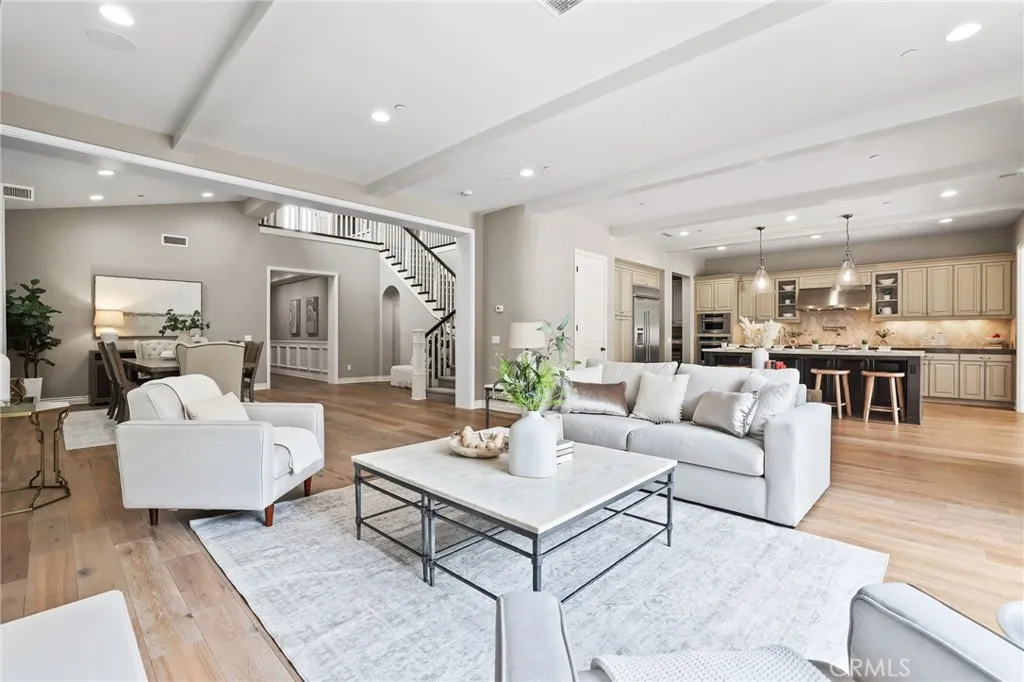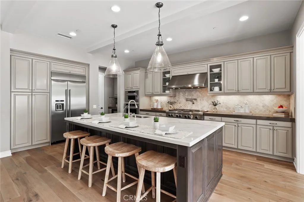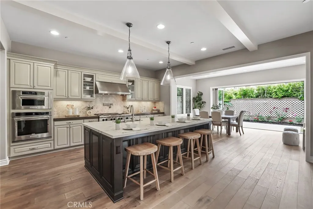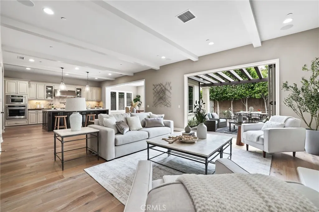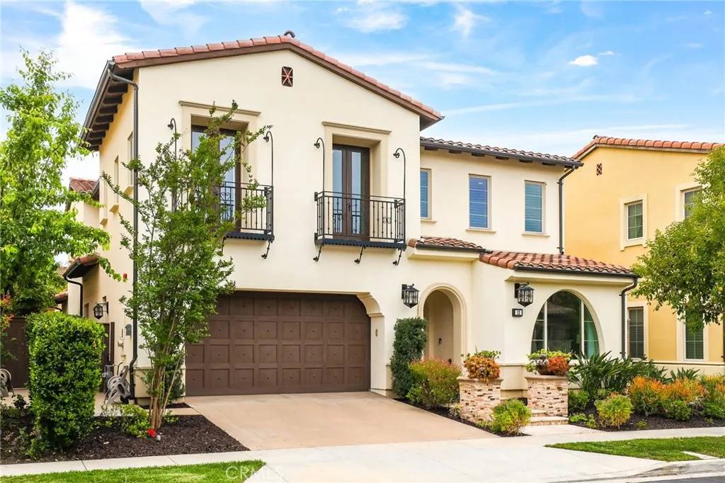 Located in the prestigious guard-gated community of The Groves at Orchard Hills, this stunning Modern Mediterranean residence offers 4 ensuite bedrooms, including a highly desirable main-level guest suite, plus an upstairs loft across approximately 4,191 square feet of thoughtfully designed living space. Enter through the solid wood front door to rich hardwood flooring and an open-concept great room showcasing soaring ceilings and elegant wood beam details. The spacious family room flows seamlessly into the dining area and gourmet kitchen, appointed with upgraded cabinetry, quartz countertops, oversized center island accented by designer RH pendant lights, walk-in pantry, stainless steel appliances, and a separate prep kitchen that provides additional cabinetry, counter space, secondary sink, and enhanced functionality for entertaining, everyday cooking, or keeping the main kitchen beautifully organized. The downstairs guest bedroom with private ensuite bath is ideal for multigenerational living, overnight guests, or a private home office. Upstairs, a generous loft provides flexible living space ideal for a media room, office, or play area. The luxurious primary suite features a spa-inspired bath and dual walk-in closets with custom built-in shelving. Two additional secondary bedrooms are generously sized, each with their own private full baths. Designed for exceptional indoor-outdoor living, the backyard offers a spacious covered patio with pergola, perfect for entertaining or everyday relaxation, with stylish seating and dining areas framed by mature landscaping for enhan