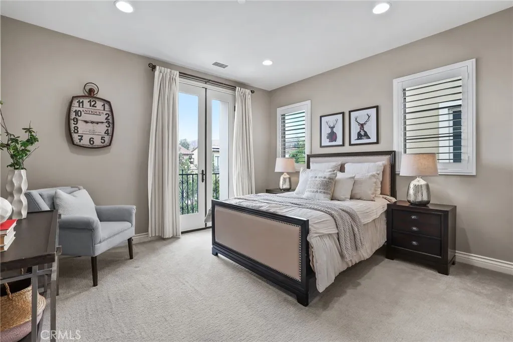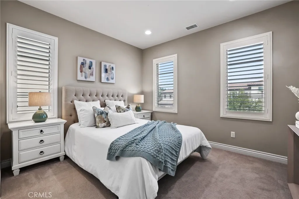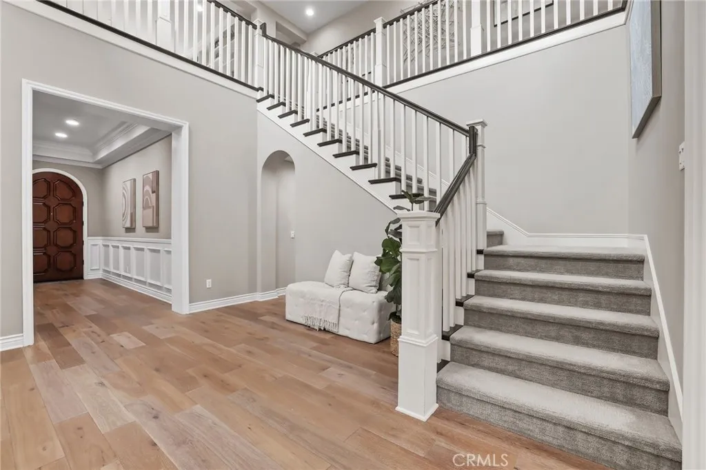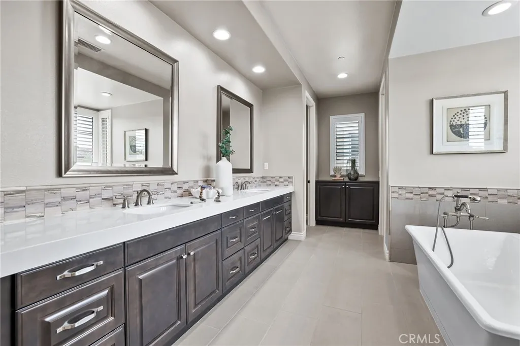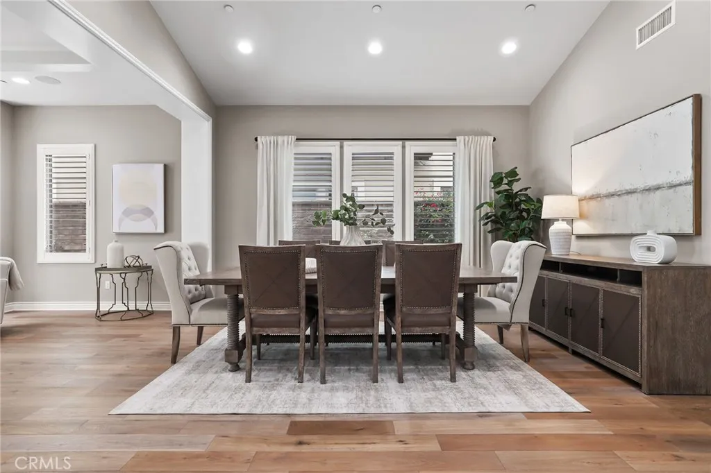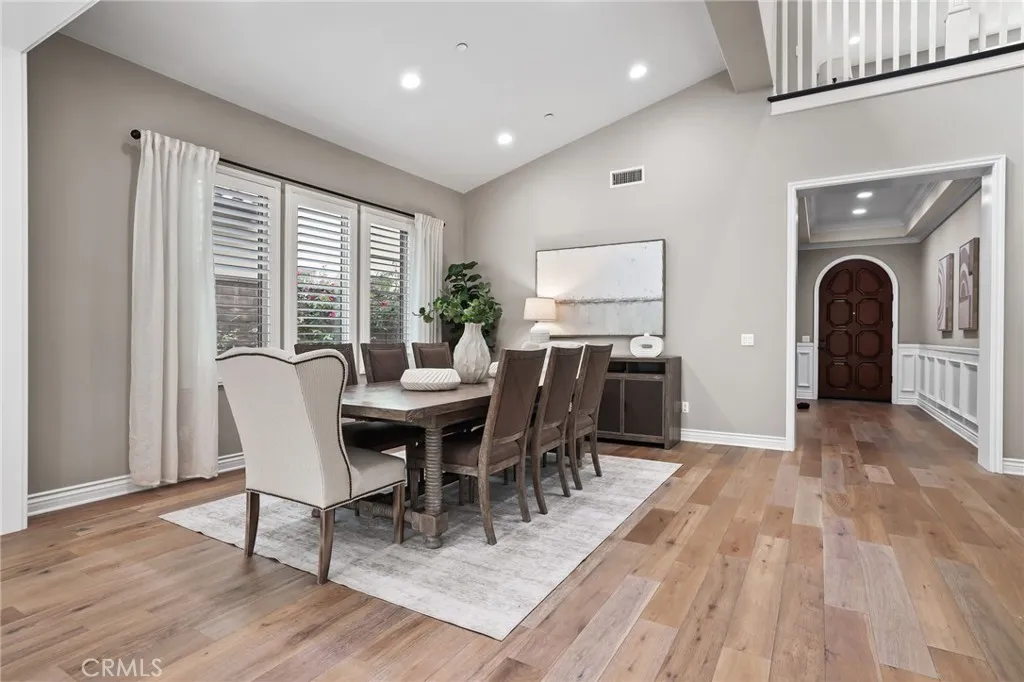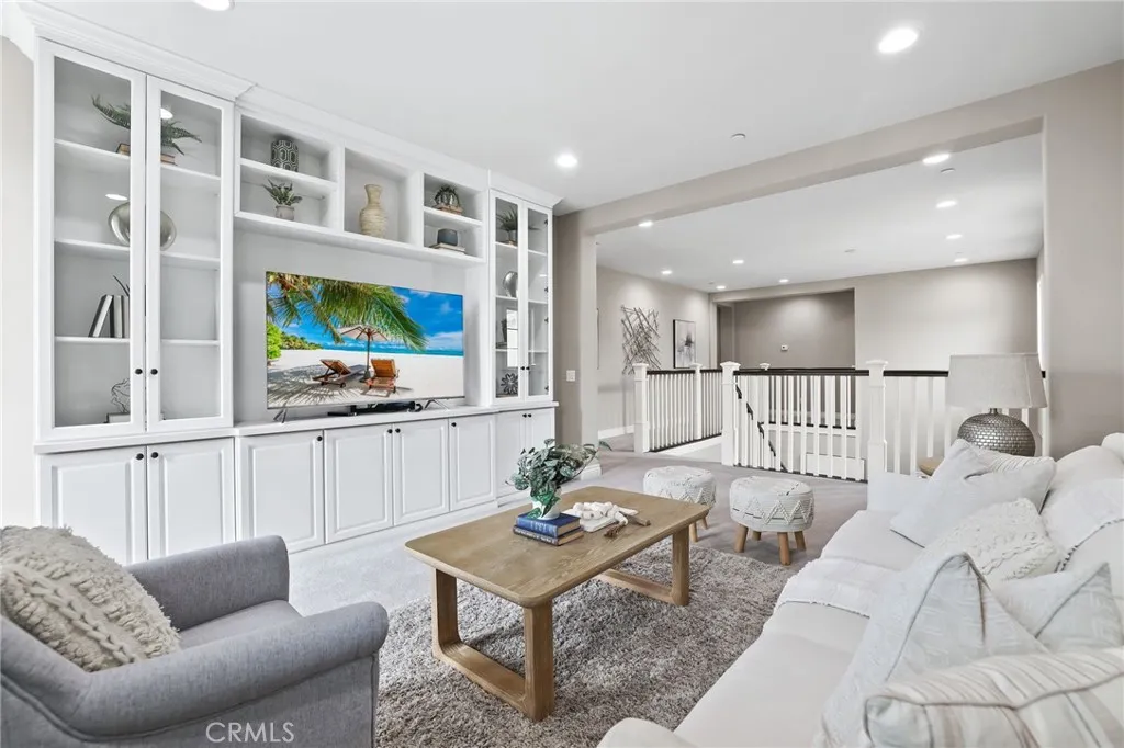 Located in the prestigious guard-gated community of The Groves at Orchard Hills, this stunning Modern Mediterranean residence offers 4 ensuite bedrooms, including a highly desirable main-level guest suite, plus an upstairs loft across approximately 4,191 square feet of thoughtfully designed living space. Enter through the solid wood front door to rich hardwood flooring and an open-concept great room showcasing soaring ceilings and elegant wood beam details. The spacious family room flows seamlessly into the dining area and gourmet kitchen, appointed with upgraded cabinetry, quartz countertops, oversized center island accented by designer RH pendant lights, walk-in pantry, stainless steel appliances, and a separate prep kitchen that provides additional cabinetry, counter space, secondary sink, and enhanced functionality for entertaining, everyday cooking, or keeping the main kitchen beautifully organized. The downstairs guest bedroom with private ensuite bath is ideal for multigenerational living, overnight guests, or a private home office. Upstairs, a generous loft provides flexible living space ideal for a media room, office, or play area. The luxurious primary suite features a spa-inspired bath and dual walk-in closets with custom built-in shelving. Two additional secondary bedrooms are generously sized, each with their own private full baths. Designed for exceptional indoor-outdoor living, the backyard offers a spacious covered patio with pergola, perfect for entertaining or everyday relaxation, with stylish seating and dining areas framed by mature landscaping for enhan