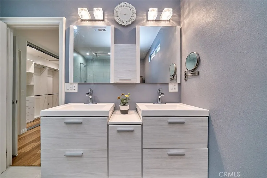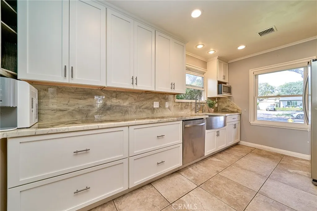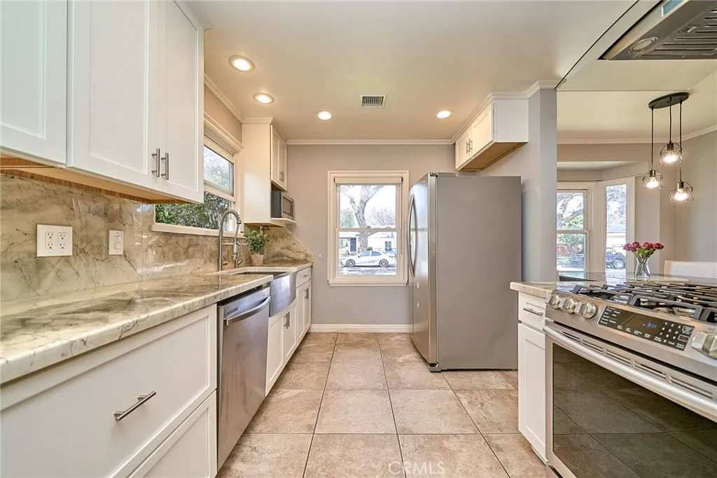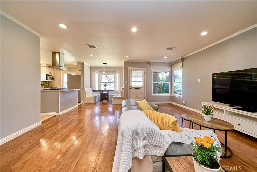 Experience the California dream in this beautiful 4-bedroom, 3-bath residence, set in a prestigious, peaceful neighborhood known for its friendly community and tree-lined streets. This home showcases a bright open floor plan with effortless flow between the living, dining, and kitchen and to the bedrooms. Elegant features include hardwood flooring, recessed lighting throughout, and a stylish chefs kitchen complete with deep drawers, self-closing cabinetry, a farmhouse sink, and an island with a built-in range and suspended hood. Two bedrooms offer en-suite baths, providing both comfort and privacy. Additional improvements include copper plumbing, dual-pane windows, central heat and A/C, and a garage with 240V EV charging capability. A split-level design leads down to two bedrooms with backyard access, while windows frame serene views of the lush, beautifully landscaped yard. The backyard is a private retreat, with charming details, manicured hardscape, and an atmosphere of calm and relaxation. Further highlights include tall closets, remote-controlled lighting throughout the home, and ample parking in front of the garage. Surrounded by mature trees and rich greenery, the home offers a rare and picturesque setting. Conveniently located just 5 minutes from the markets, this is a special opportunity to enjoy beauty, comfort, and everyday convenience in one exceptional home.