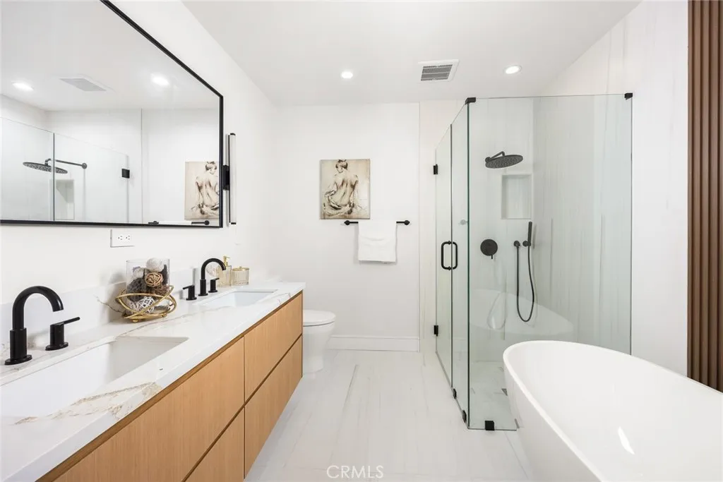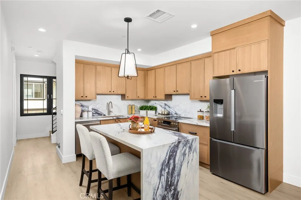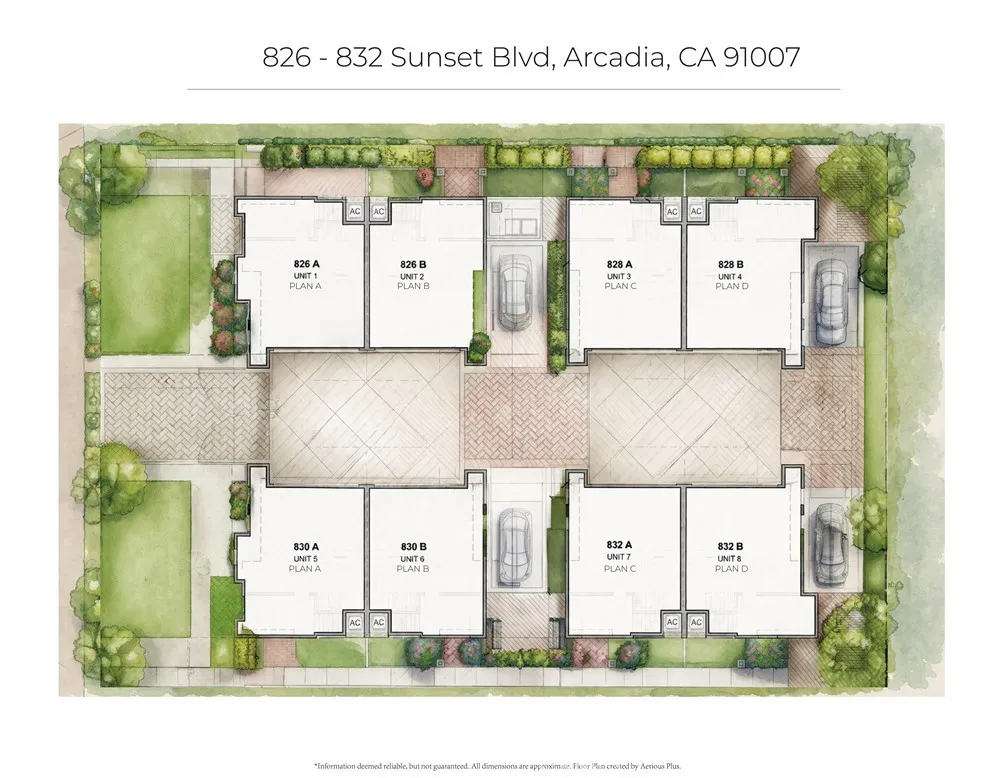 Stunning brand-new 8-unit luxury complex with modern design in the highly desirable Arcadia, located within the award-winning Arcadia Unified School District and developed by Rodeo Development. Conveniently situated near Westfield Santa Anita, Santa Anita Park, the Los Angeles County Arboretum and Botanic Garden, Santa Anita Golf Course, and USC Arcadia Hospital, with easy access to Interstate 210. This property features a 4-unit duplex-style building, with each residence shares only one wall and has three sides exposed to natural light, providing excellent brightness and cross-ventilation. Each unit offers approximately 1,660 sq. ft. of living space with 3 bedrooms and 3 bathrooms. The open and functional floor plan showcases European-style windows, luxury vinyl plank floors, and designer finishes throughout. The second level features a spacious great room, dining area, and a gourmet kitchen equipped with quartz countertops, Bosch appliances, and custom cabinetry, seamlessly connected for both everyday living and entertaining. One en-suite bedroom is also conveniently located on this level. The third level is dedicated to the primary suite, complete with a designer bathroom, along with an additional well-appointed en-suite bedroom.This all-electric home features a heat pump A/C system, electric water heater, stove, washer, and dryer (no gas service). Each unit includes a fully paid 6-panel solar system, a private outdoor space, and a dedicated laundry area. The attached 2-car garage is equipped with a Level 2 EV charger for each unit. Located near Hugo Reid Elementary Scho