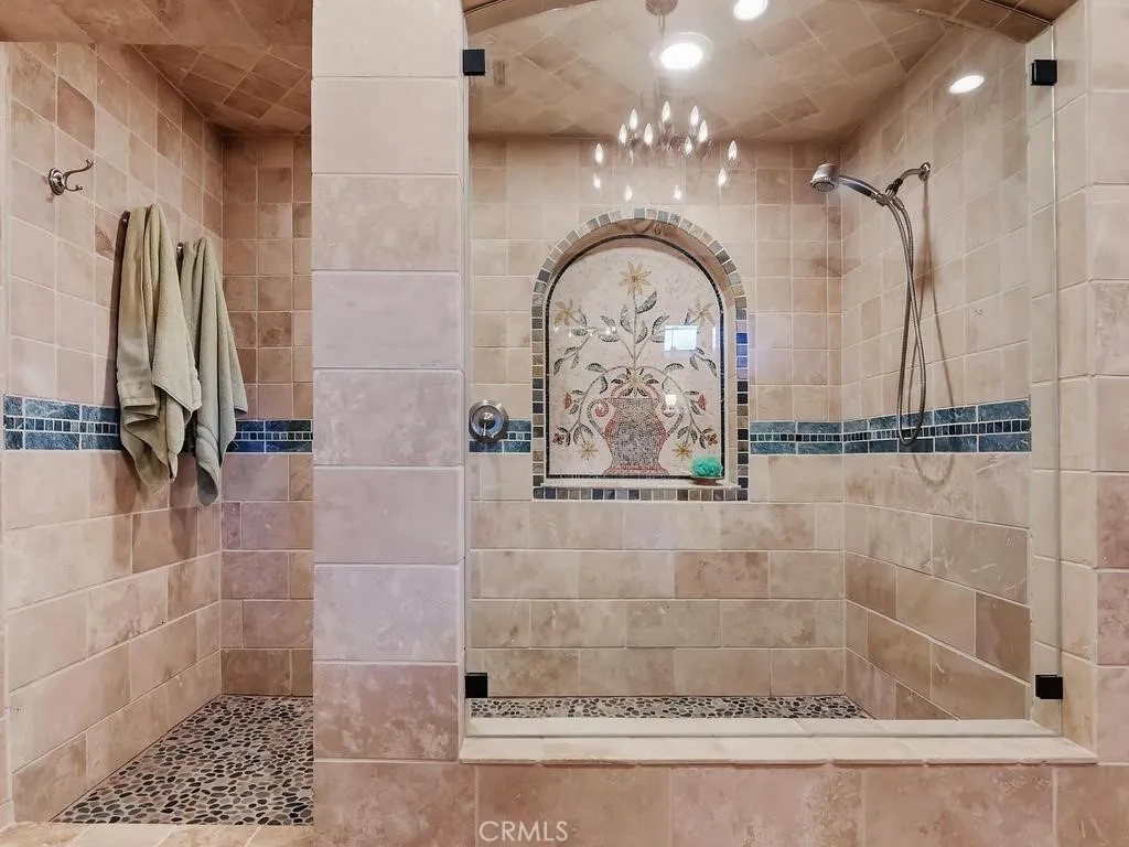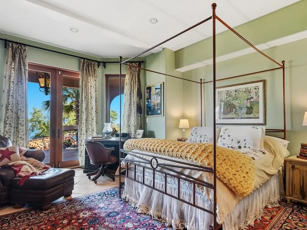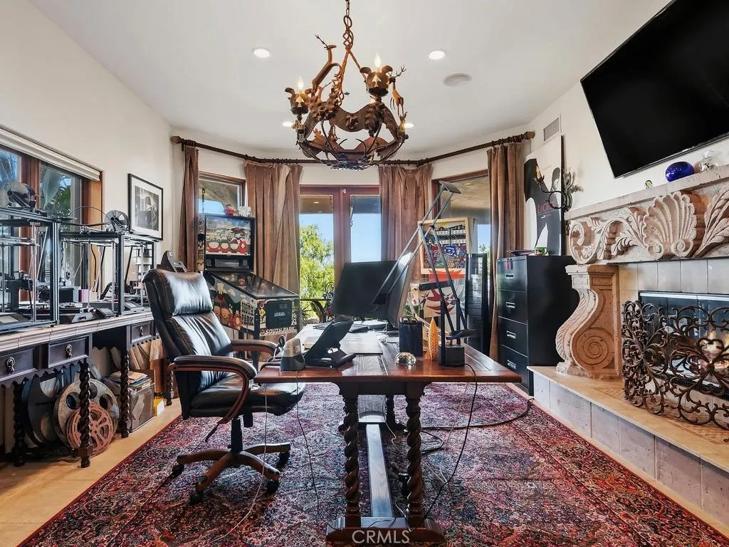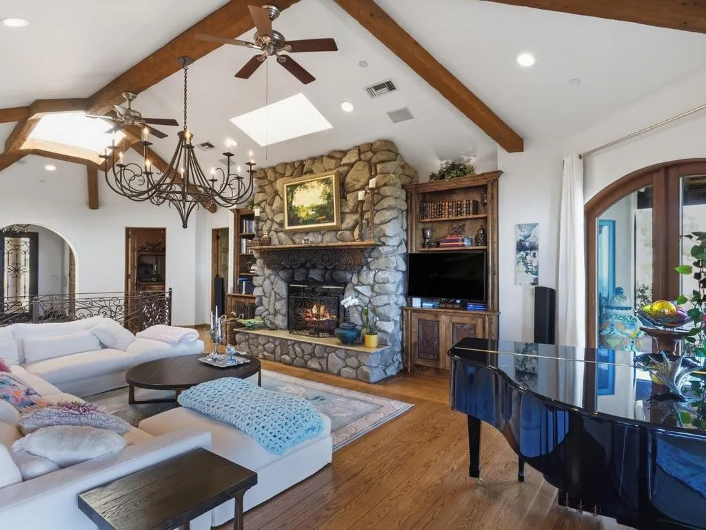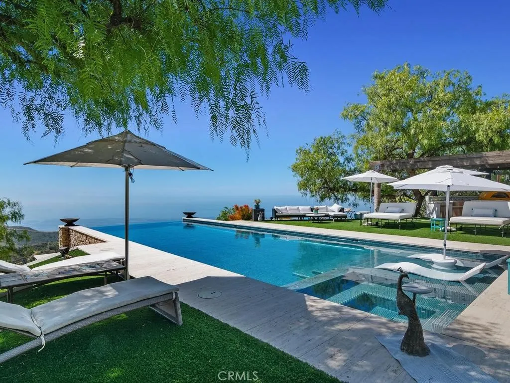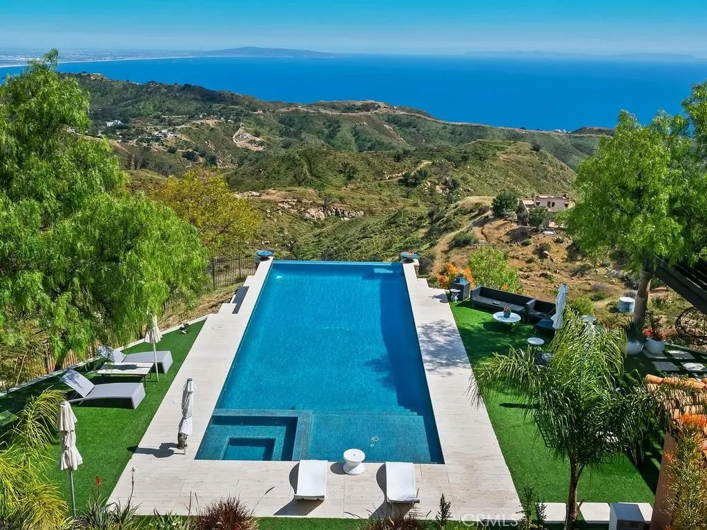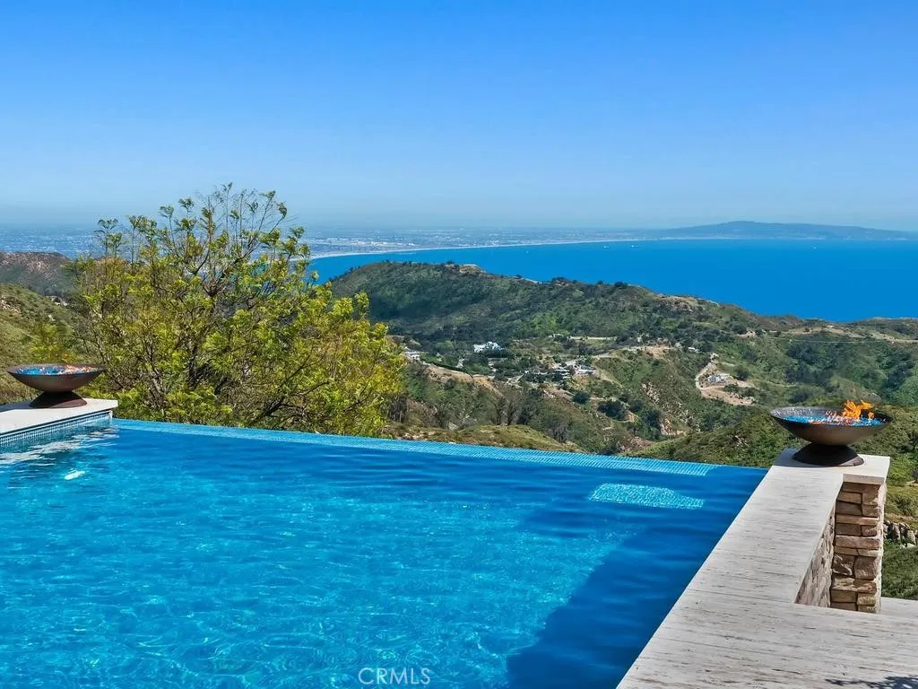 Luxury Estate with Panoramic Ocean Views - 10 Acres - Topanga/Malibu. Set atop 10 private acres in the coveted Topanga/Malibu area, 22331 Swenson Dr. offers 7,000 sq ft of refined living with sweeping ocean views from Palos Verdes to Point Dume in Malibu. This exceptional estate blends grand scale with custom craftsmanship and resort-style amenities. A dramatic open floor plan features vaulted and open-beam ceilings, solid oak and travertine flooring, cantera stone columns, stained-glass accents, and a custom spiral staircase. The living, dining, and gourmet kitchen areas flow seamlessly, enhanced by a built-in audio system throughout. The chefs kitchen includes a 6-burner Wolf range with griddle & grill, professional hood, Miele dishwasher, Sharp microwave drawer, KitchenAid trash compactor, granite countertops, alder cabinetry, pot filler, and a large island. The home offers 6 bedrooms and 7 bathrooms, including two primary suites with fireplaces. A flexible bonus space can serve as an office, art studio, or 7th bedroom. Spa-style baths feature custom tile, glass sinks, and a steam room. Designed for entertaining, enjoy a game room with two-way fireplace, media room with wet bar and projection TV, and a poolside studio with bathroom, fireplace, and laundry hookups. Laundry is available on all three levels, along with a central tech room. Outdoor living is unmatched with a 3,000 sq ft covered patio deck, Spanish tile, and custom iron railings overlooking a glass tiled infinity pool and spa with built-in cover and a waterfall garden. The outdoor kitchen includes a built-in
