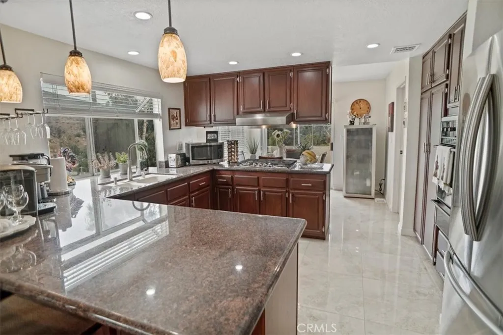 Beautiful, spacious retreat with panoramic views in the picturesque and highly sought-after Shadow Hills community. This home perfectly blends tranquility with accessibility, conveniently located near Burbank, Glendale, Pasadena, and Downtown Los Angeleswhile maintaining a peaceful distance from the hustle and bustle of city life. Nestled on a knoll, the property offers enchanting evening views of twinkling canyon lights from surrounding homes. Step inside to an inviting, expansive open floor plan highlighted by a spacious living room with dramatic vaulted ceilings, abundant natural light throughout, and French doors leading to a patio deck. A standout feature is the remodeled chefs kitchen, complete with granite countertops, stainless steel appliances, rich cabinetry, and a cozy breakfast nook that opens to a private balconyperfect for dining al fresco while enjoying the views. The adjoining family room features beautiful wood laminate flooring, a charming fireplace, and sliding doors that lead to a large balcony, creating an ideal space for relaxing or entertaining. The main level also includes a remodeled bathroom, laundry room, and direct access to the garage. Upstairs, the primary suite offers a walk-in closet, private balcony with scenic views, and a stunning remodeled bathroom featuring elegant tile flooring, a soaking tub, walk-in shower with seating and shelving, and a dual-sink vanity with stylish lighting fixtures. Two additional spacious bedrooms and another remodeled bathroom complete the upper level. The front yard boasts an oversized driveway with RV parking