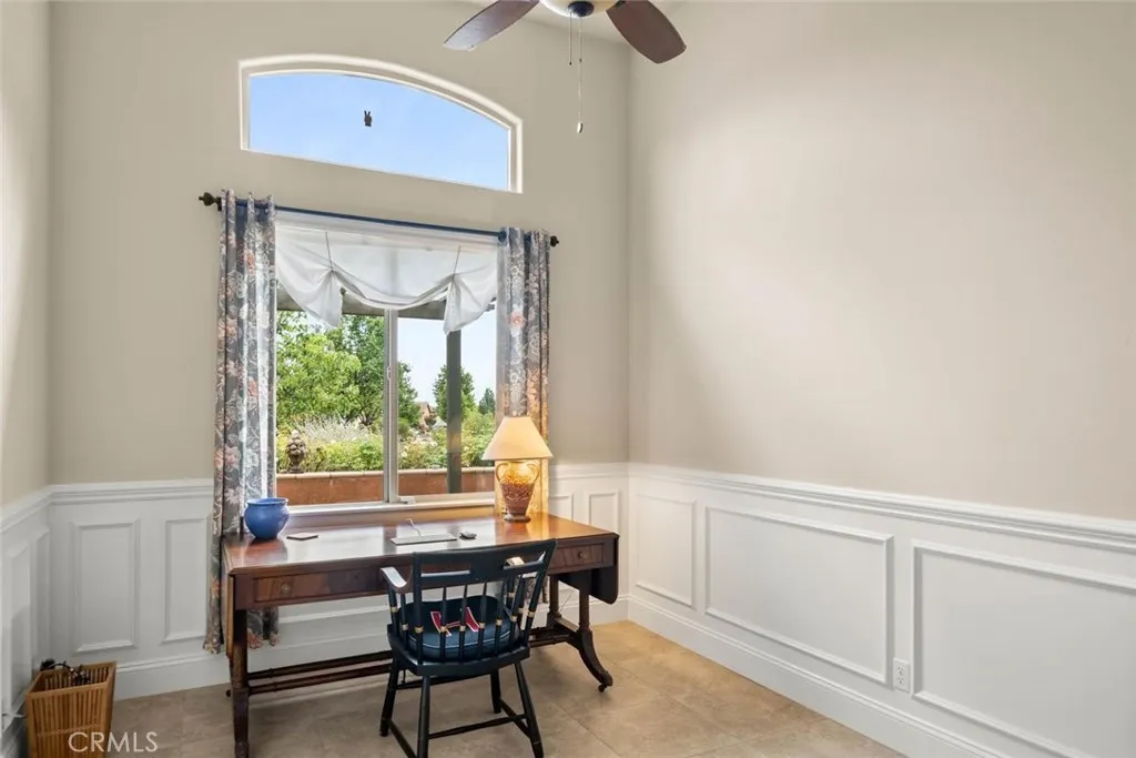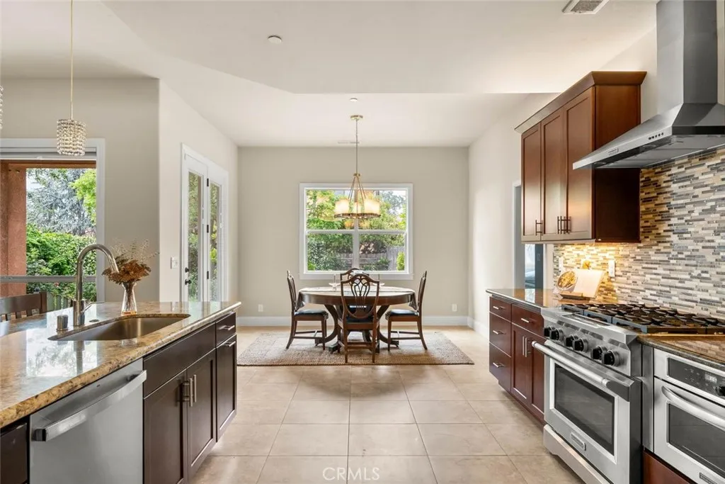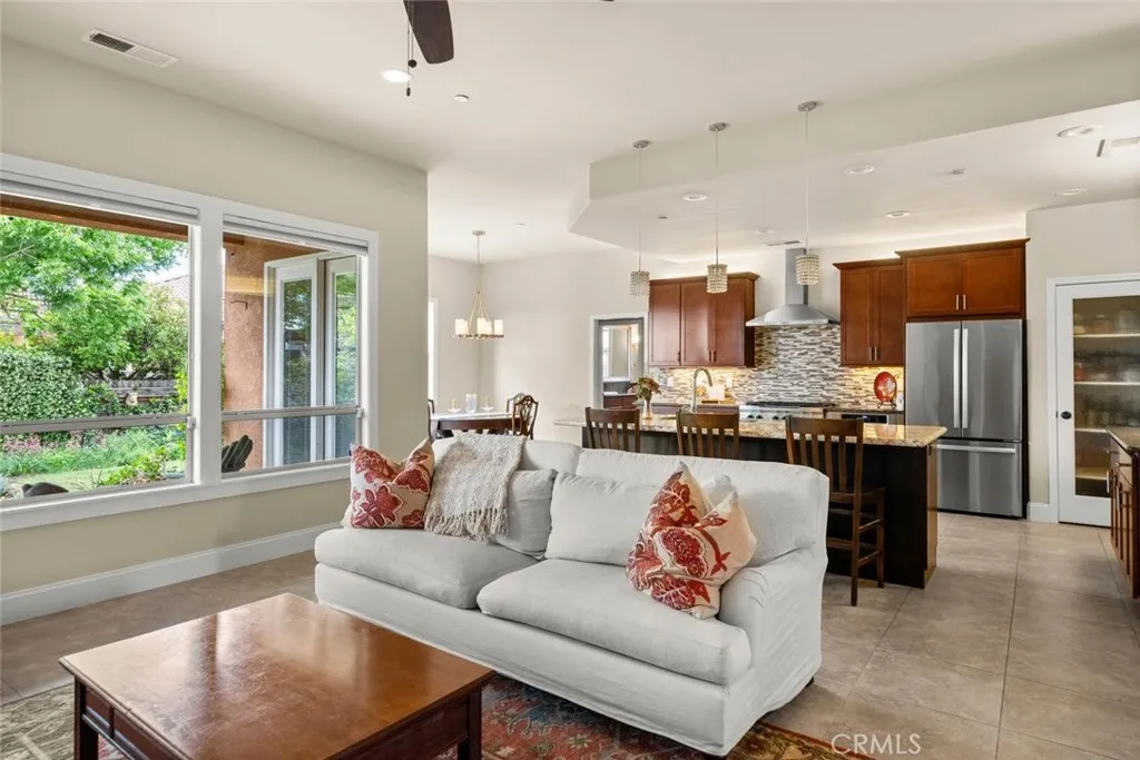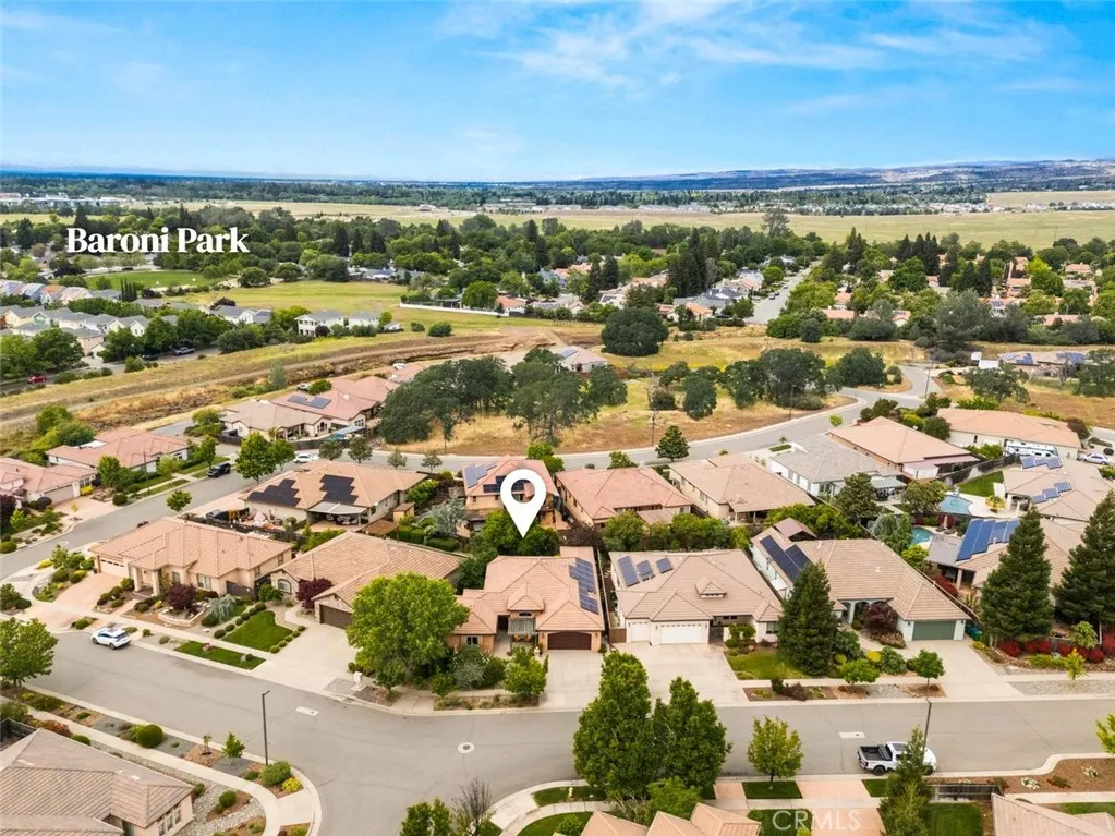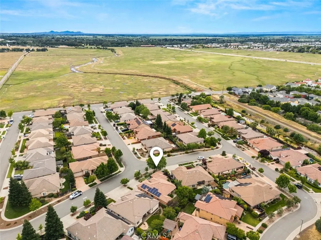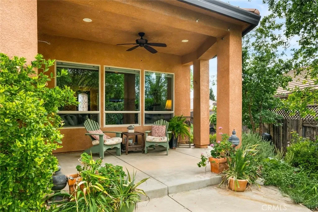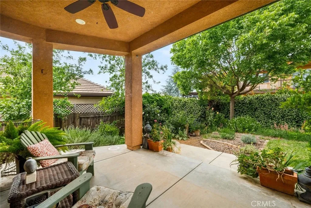 Step into timeless elegance with this beautifully appointed Tuscan-style home, where charm meets modern comfort in an inviting open floor plan designed for everyday living and effortless entertaining. This thoughtfully designed residence offers a split floor plan with three spacious bedrooms plus a separate office filled with natural lightperfect for working from home or a quiet retreat. Rich architectural details like classic wainscoting and newly refreshed imperfect smooth paint create a warm, sophisticated ambiance throughout. At the heart of the home, the stunning kitchen features granite countertops, stainless steel appliances, and a generous pantry, all overlooking the expansive living room anchored by a cozy gas fireplace. Seamlessly blending indoor and outdoor living, the living space opens to a serene backyard garden oasis complete with mature shade trees, and year-round herb and flowering borders. Enjoy organically tended native and drought-resistant front and rear yards adorned with beautiful plantings, including native oaks, gracious Pistache tree (gorgeous color in fall), red bud, espaliered Meyer lemon, fragrant star-Jasmine, and many fragrant colorful cottage garden roses, providing a sense of sanctuary well-being close to all that Chico has to offer. Additional highlights include elegant travertine tile flooring, a durable tile roof, and owned solar for energy efficiency. The charming front patio with a pergola offers the perfect spot to sip your morning coffee and unwind to Birdsong and flowers, with views out to the fields beyond and the Sutter Buttes in t