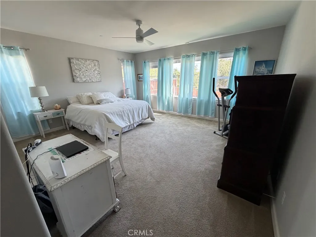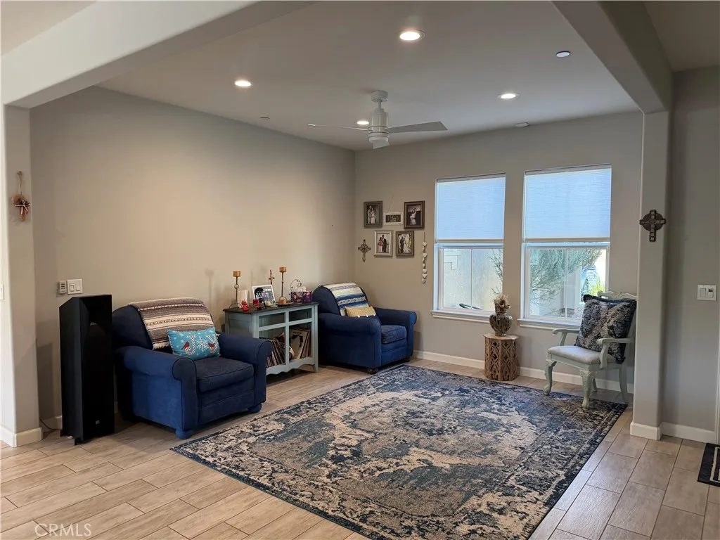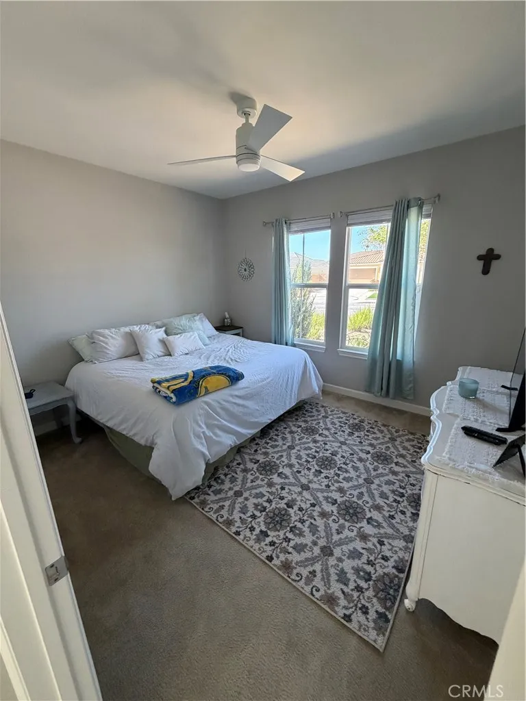 This stunning 4-bedroom, 2.5-bath home, spanning nearly 2,700 square feet, is located in the desirable Heritage Lake neighborhood. Upon entering through the electronic key lock, you are greeted by a spacious, bright great room featuring luxury vinyl tile flooring. The kitchen boasts white shaker cabinets, stainless steel appliances, quartz countertops, and a large island ideal for meal preparation and entertaining, complemented by both a gas stovetop and electric oven. The great room is designed for comfort, equipped with a large ceiling fan and a gas fireplace, and is fully wired for an entertainment system. The home includes both a formal dining room and a breakfast room, providing flexibility in furnishing. The laundry room is practical, featuring a deep sink, cabinets, and ample shelving for storage. The three-car garage includes a workshop area with a workbench and additional storage. Outdoor living is enhanced by a large California room with a fan, leading to a beautifully landscaped backyard that requires low maintenance. The patio is spacious enough for a barbecue setup, and the yard includes designated areas for games like bocce ball and horseshoes. The scenic views from the backyard include neighborhood landscaping and distant mountains, with seasonal highlights such as snow-capped peaks in winter and hot air balloons in spring. The home is equipped with custom underground drainage, new rain gutters, and a soft water system that provides purified water at every faucet, including an alkaline water option in the kitchen. The master suite features a large walk-in clo