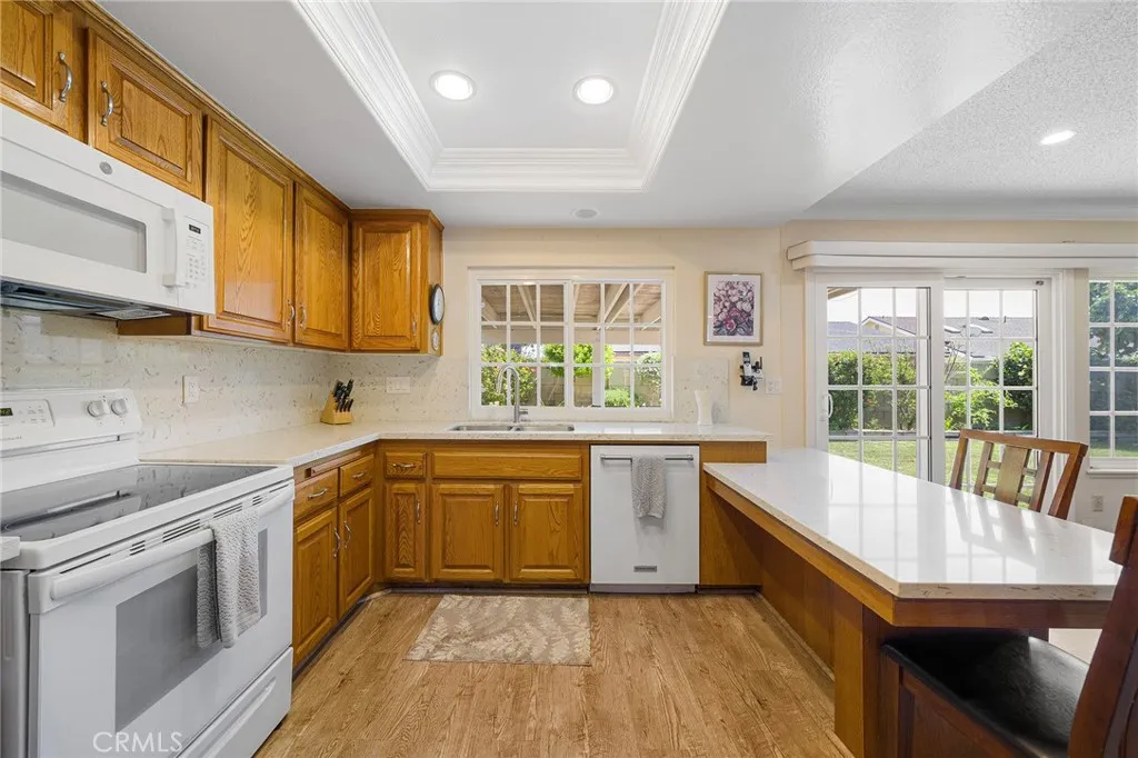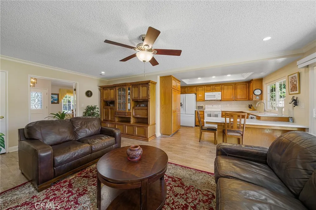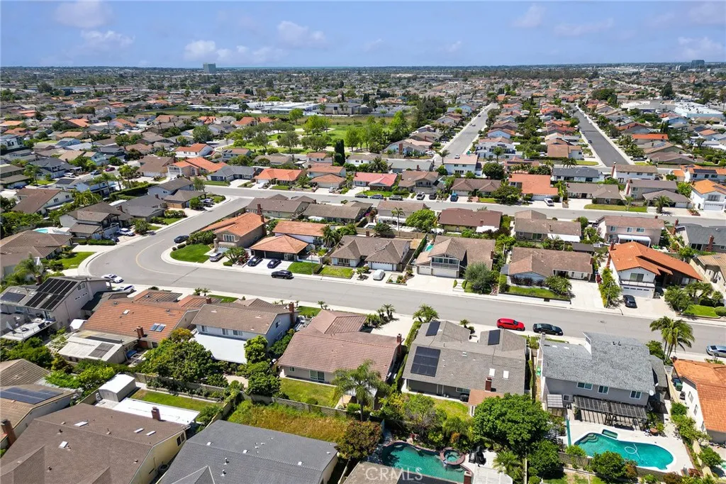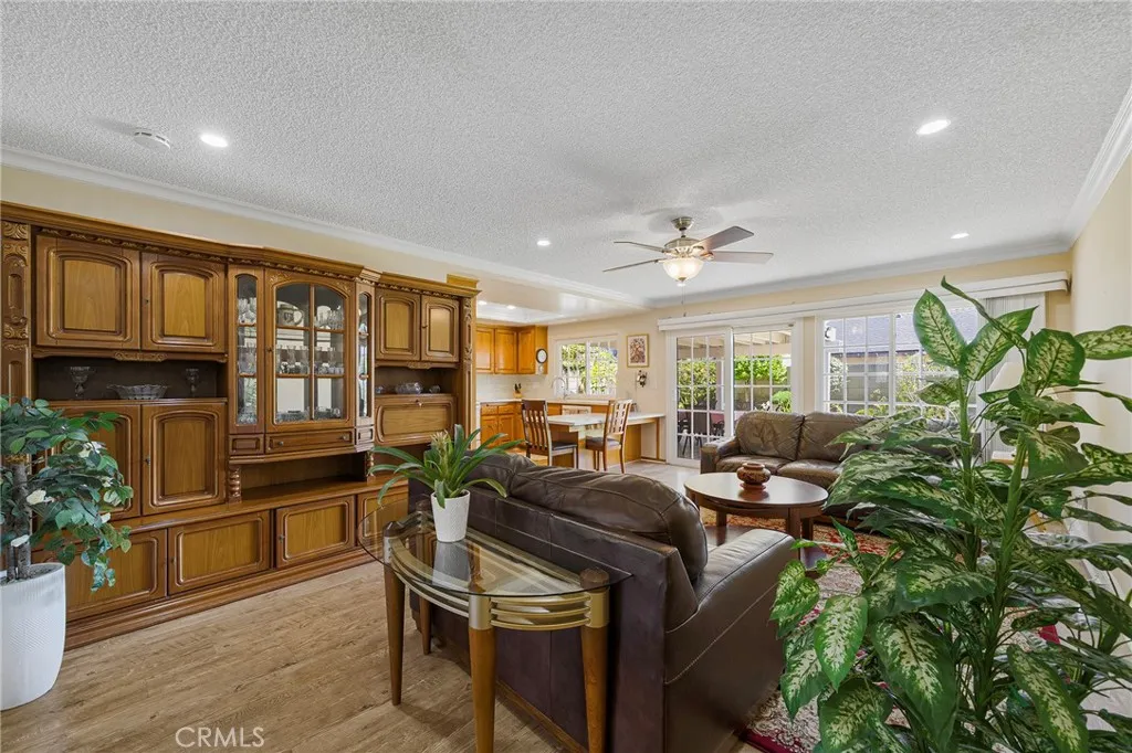 Welcome to this beautifully maintained single-story home in the heart of Fountain Valley, offering approximately 1,800 square feet of comfortable living space. From the moment you arrive, youll be impressed by the lush landscaping and charming curb appeal, highlighted by swaying palm trees and a durable tile roof. Step inside to discover an immaculate interior featuring recessed lighting, elegant crown molding, and a thoughtfully updated kitchen with modern countertops, an electric stove, and built-in microwave. Wood laminate flooring flows seamlessly through the entry, family room, and kitchen, creating a warm and inviting atmosphere. This versatile floor plan includes spacious bedrooms, with one currently configured as a home officeperfect for todays lifestyle. The updated bathrooms add a fresh, modern touch, including a ceiling fan in the main living area to enhance comfort year-round. Abundant cabinetry and storage space can be found throughout the home, all complemented by a neutral color palette ready for your personal style. The garage offers even more functionality with additional built-in storage and a convenient laundry area complete with a utility sink. Step outside to your own private backyard retreat, featuring mature fruit trees, a lovely patio cover, and plenty of space to relax or entertain. Its the perfect setting to enjoy Southern Californias beautiful evenings. This home truly combines comfort, style, and practicalitydont miss this exceptional opportunity!
